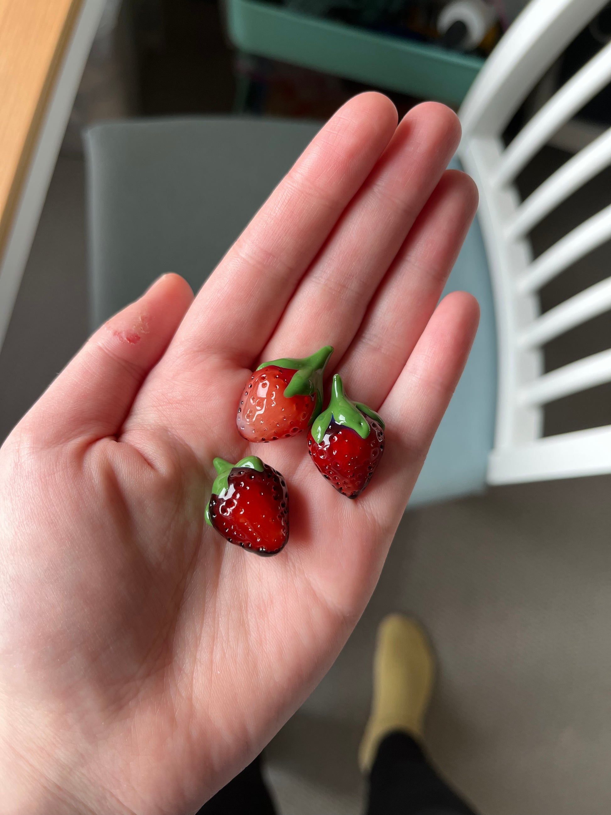 Dimensions: Duck approximately 1.25 inches x 1.5 inches x 1.5 inches, each strawberry approximately 1 inch x 0.75 inches x 0.75 inches