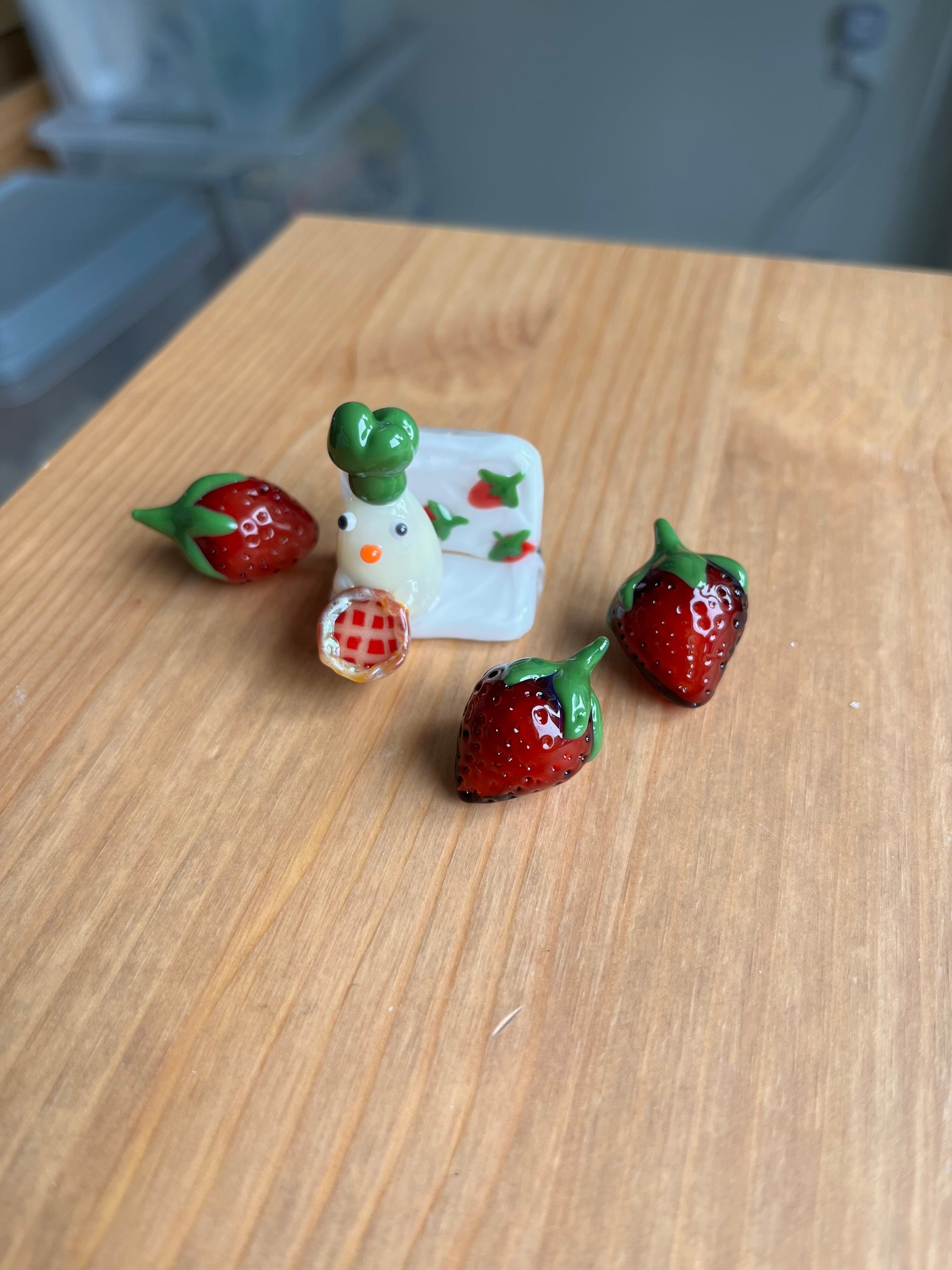 These are glass figurines of a baking duck and three strawberries for Katrina. : )