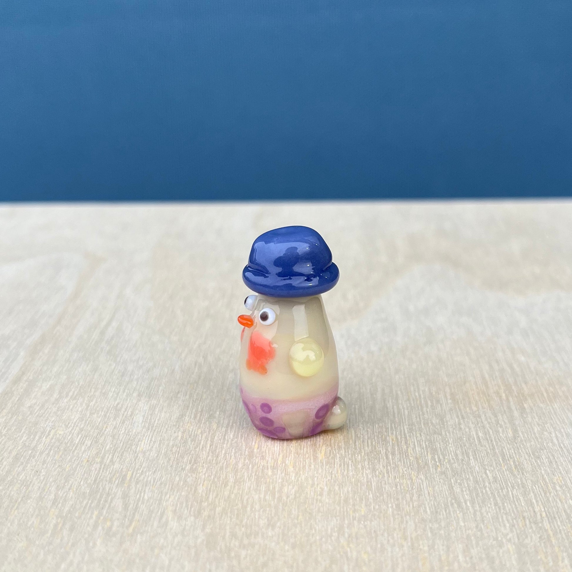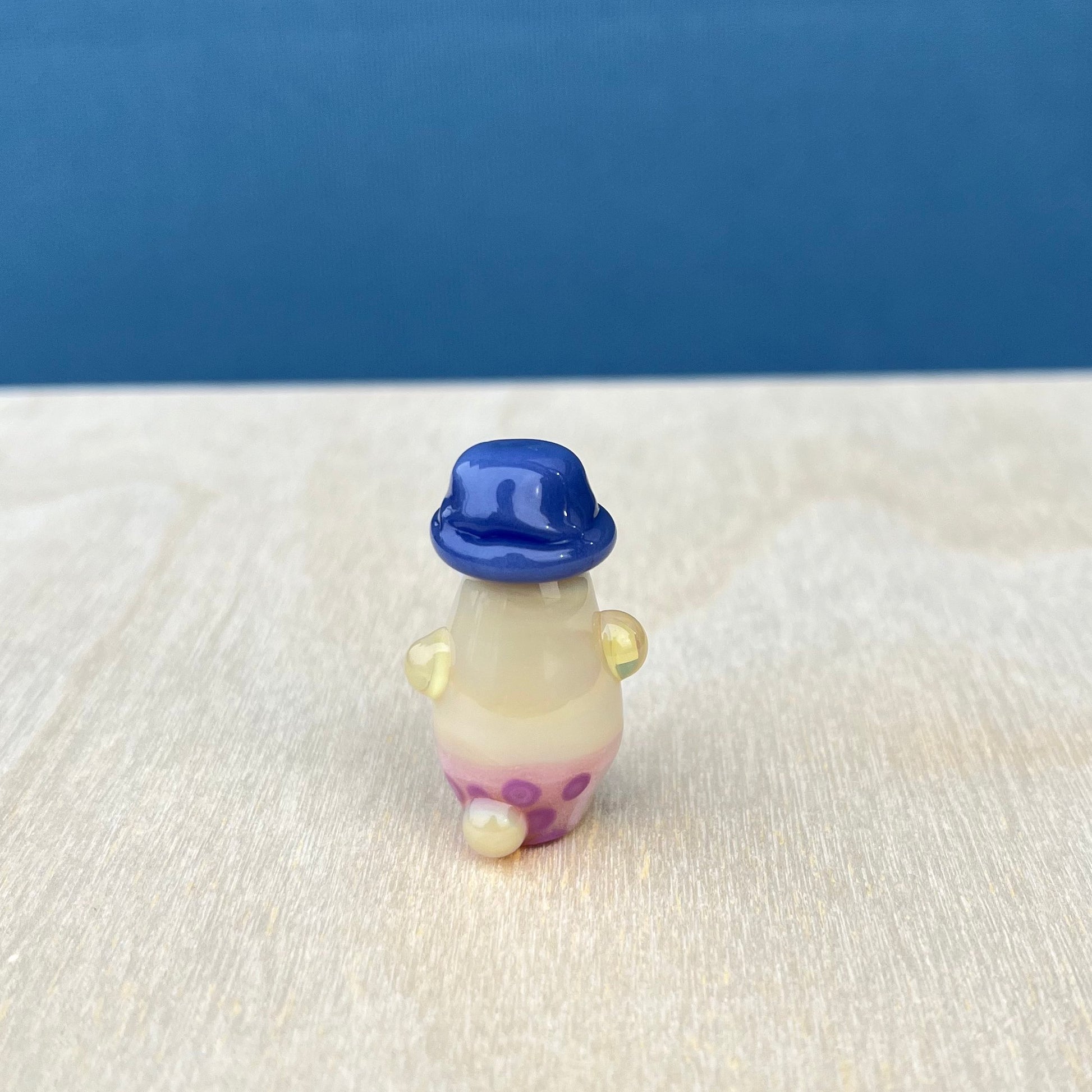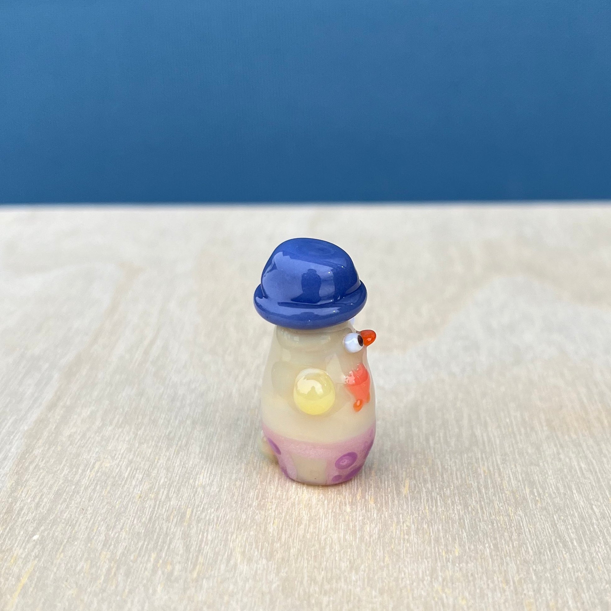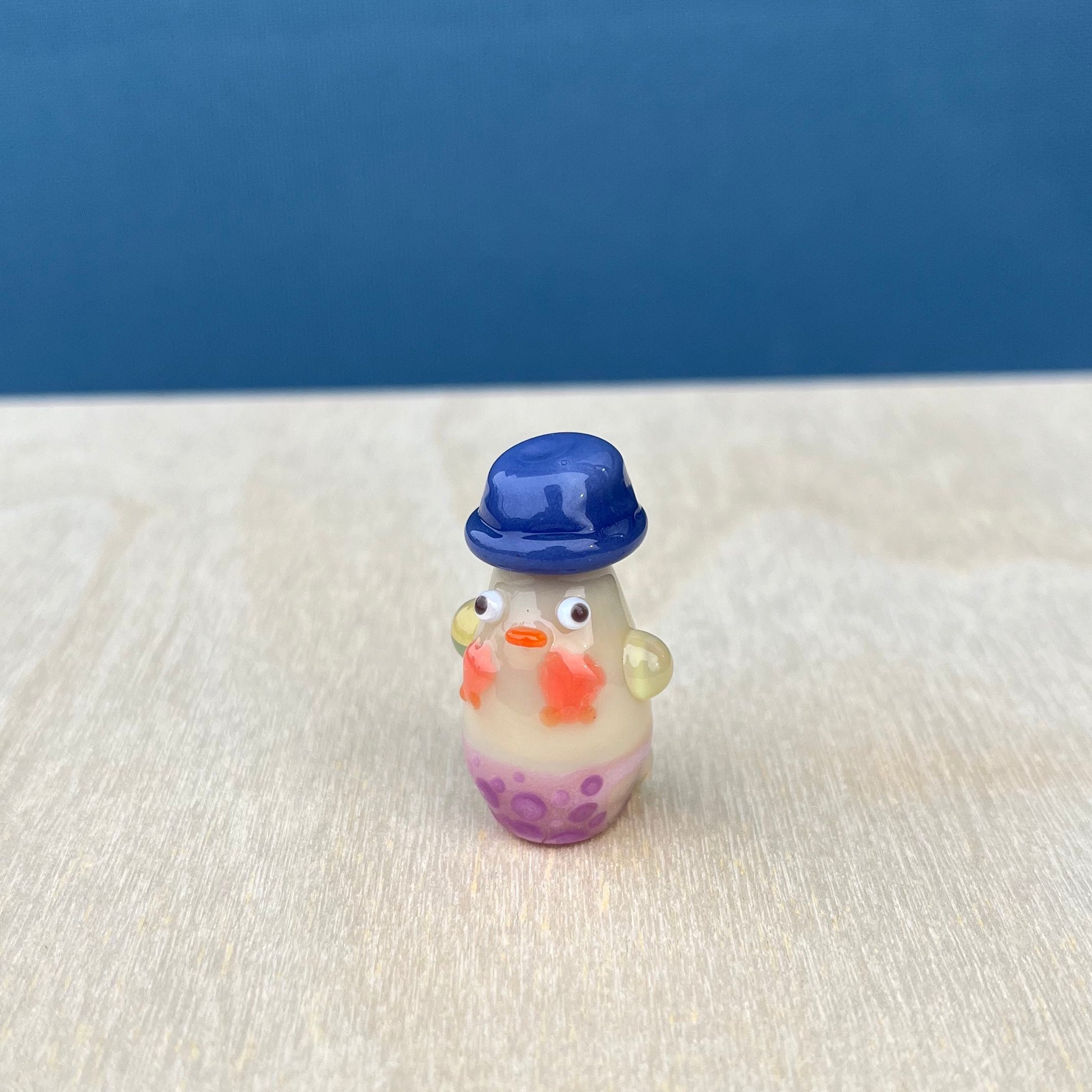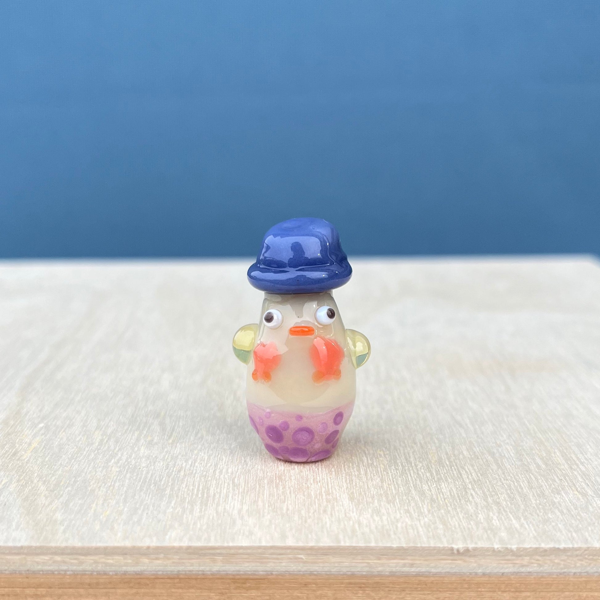 This is a glass figurine of a duck with a bucket hat, polka-dot bikini bottom, and scallop shell bikini top! : )