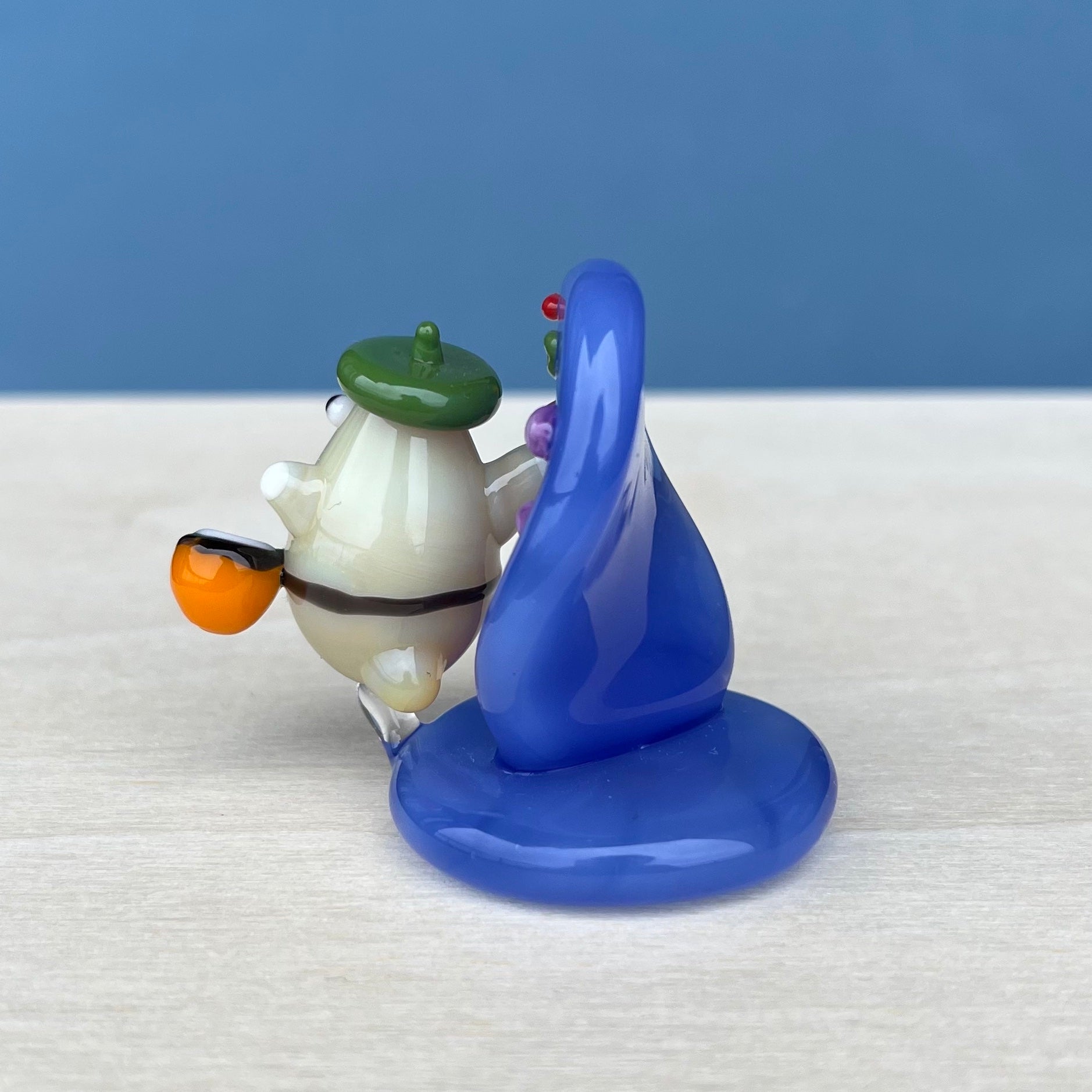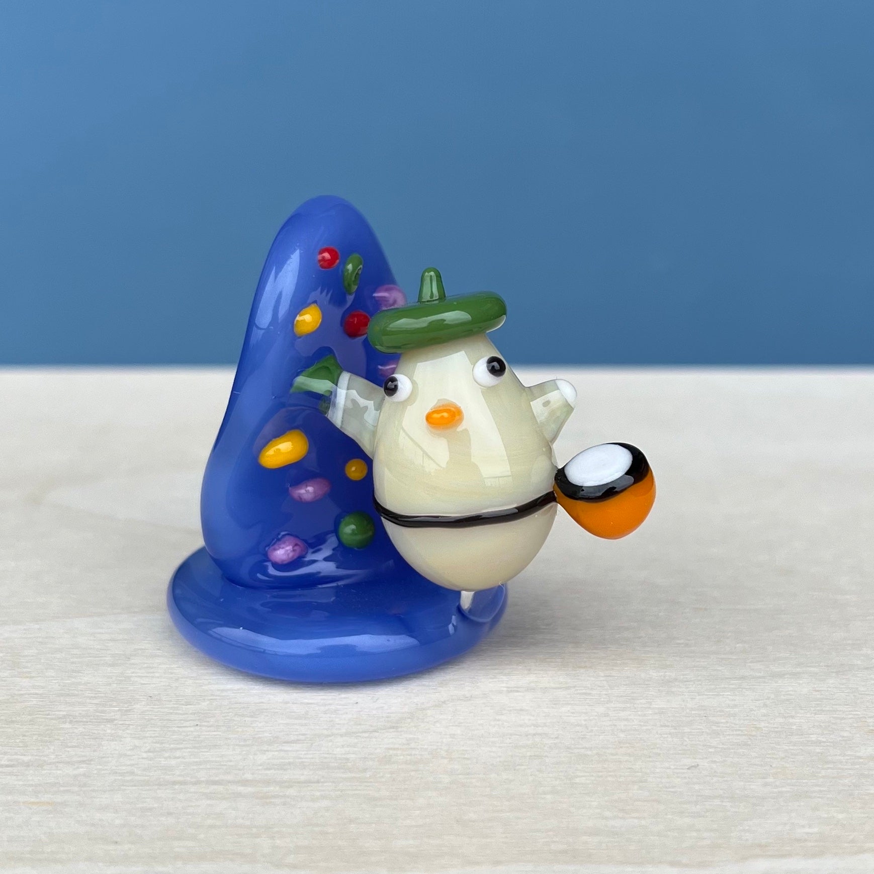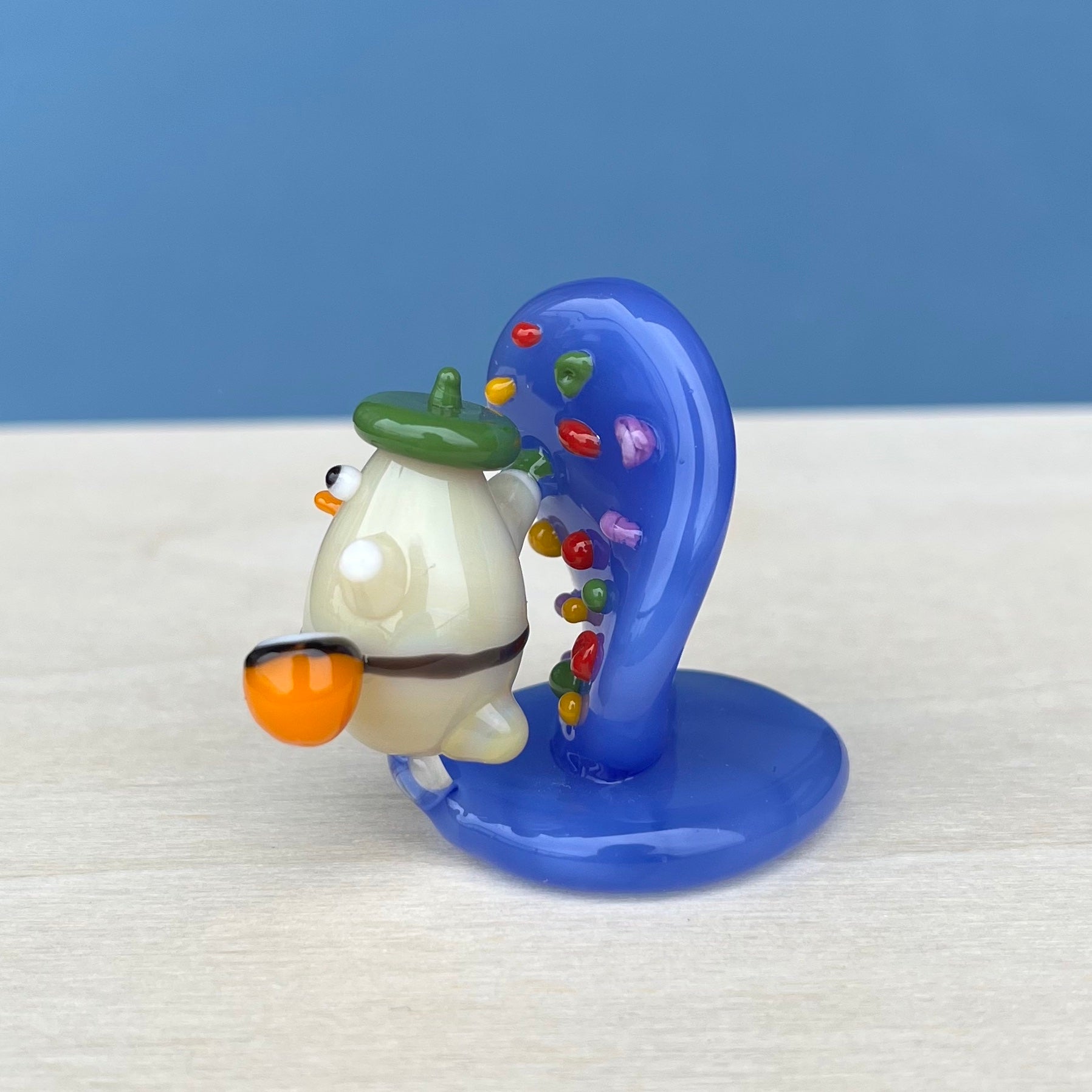 This is a glass figurine of a duck on a bouldering wall. This duckie has a chalk bag and even has chalk on their hands! : )