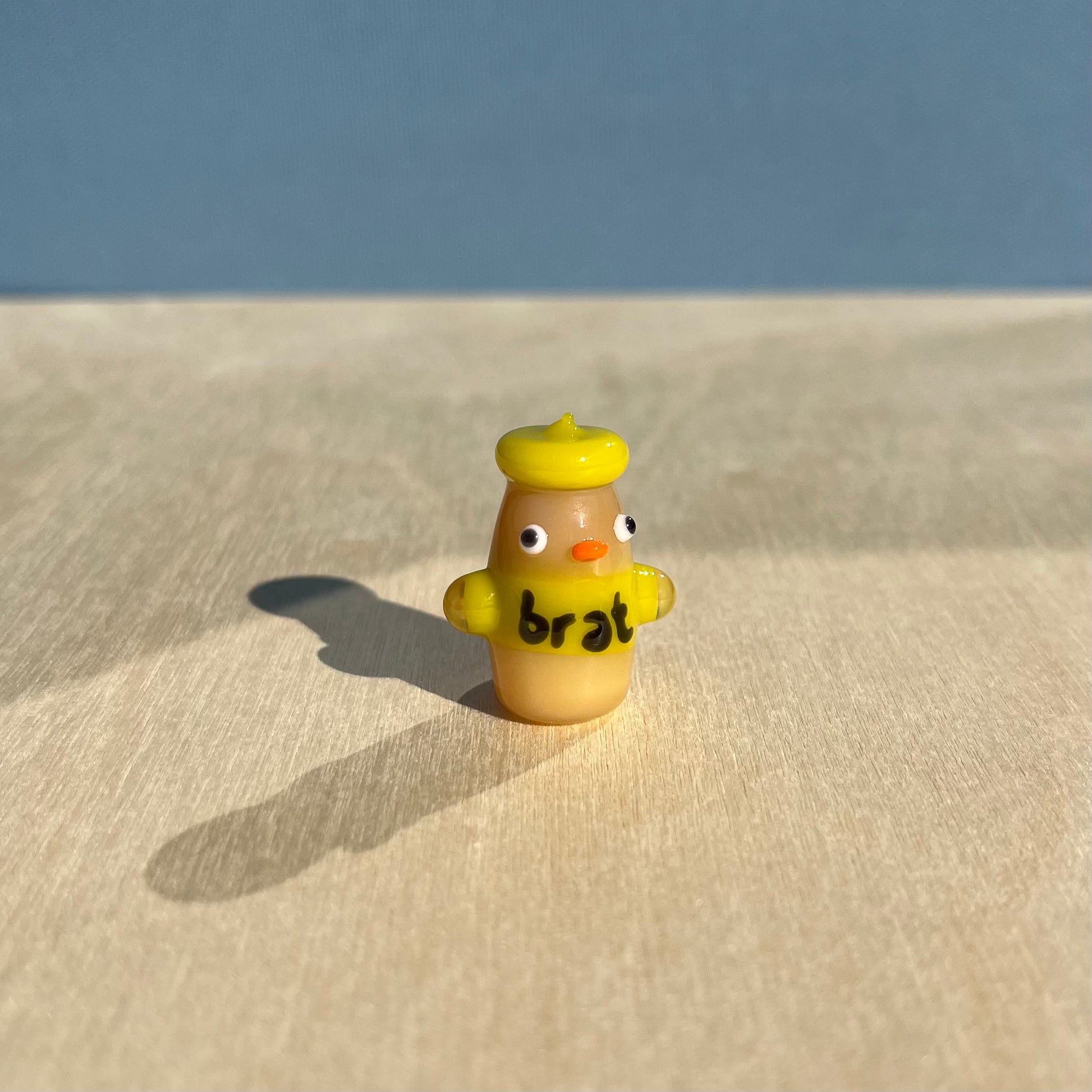 This is a glass figurine of a duck with a brat summer shirt. : )