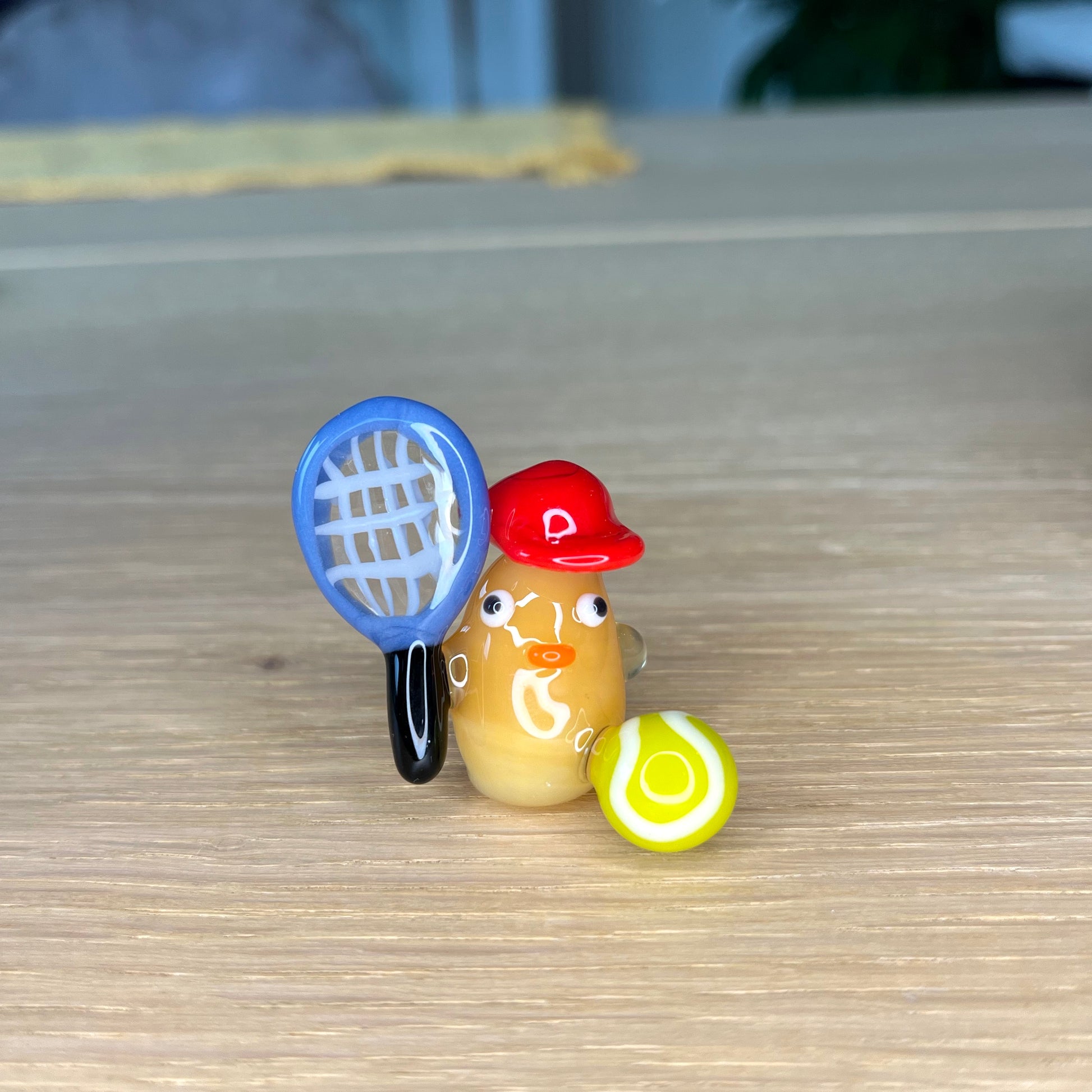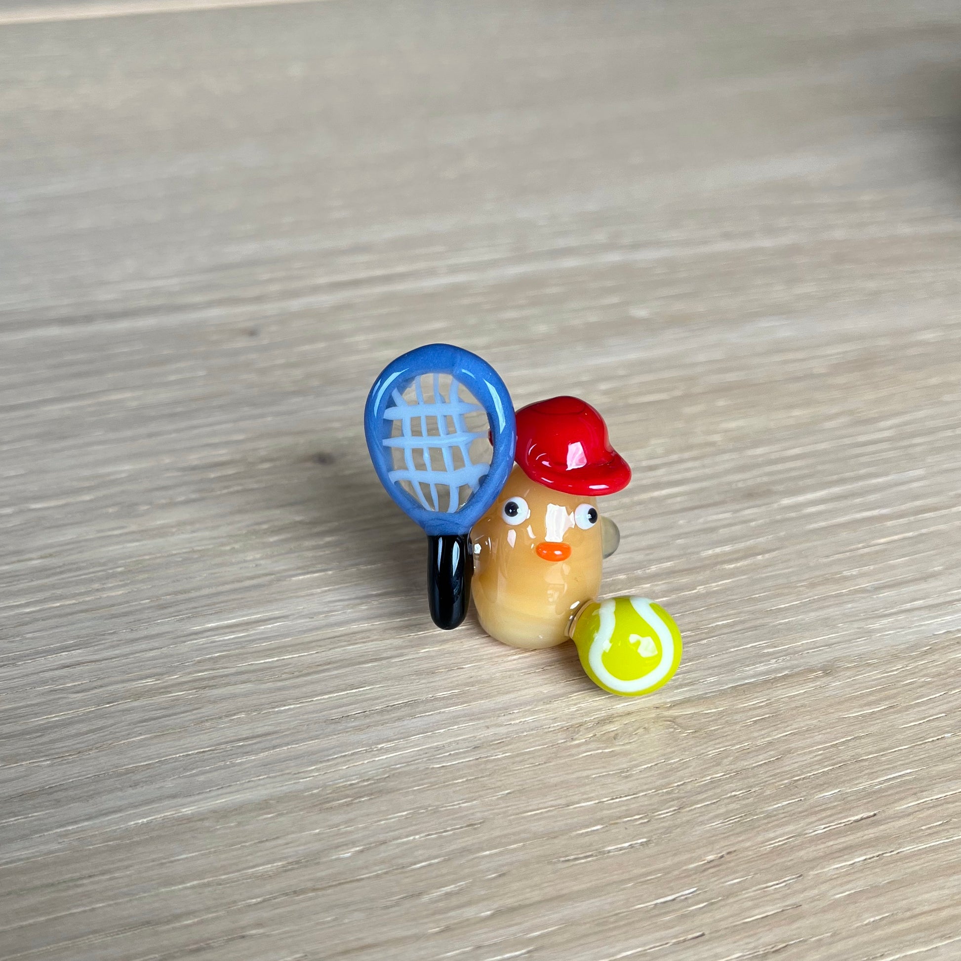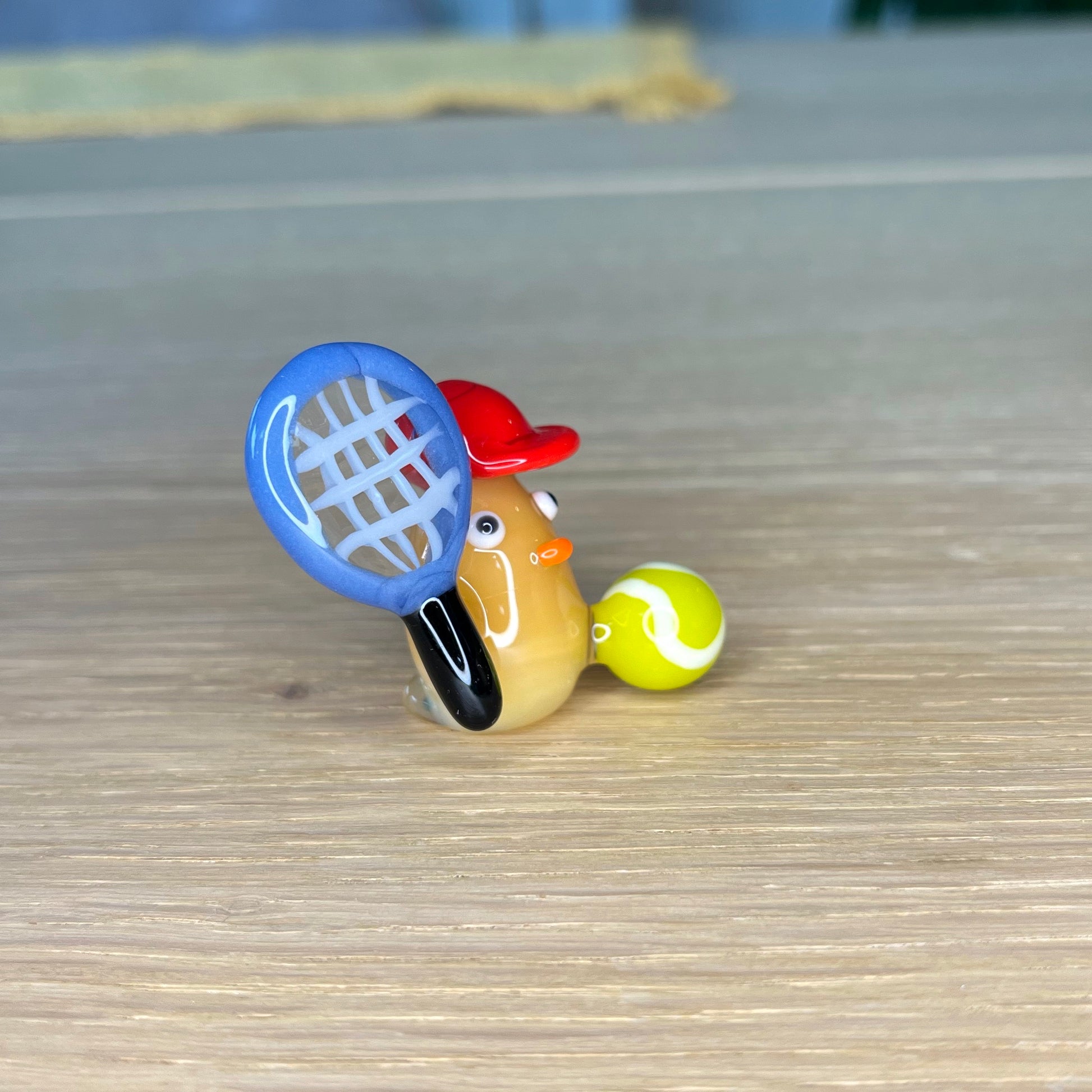 This is a glass figurine of a duck playing tennis for Faith. : )