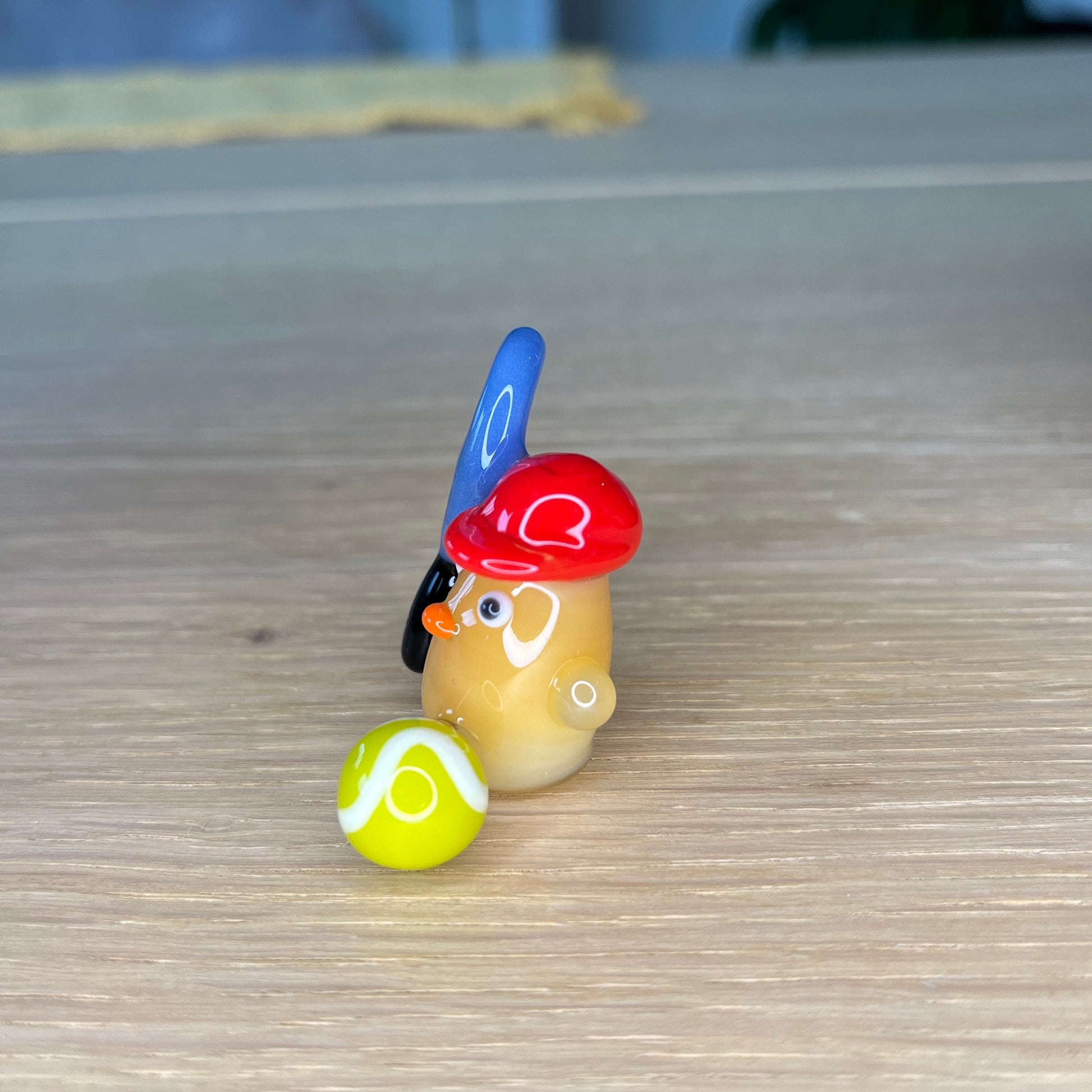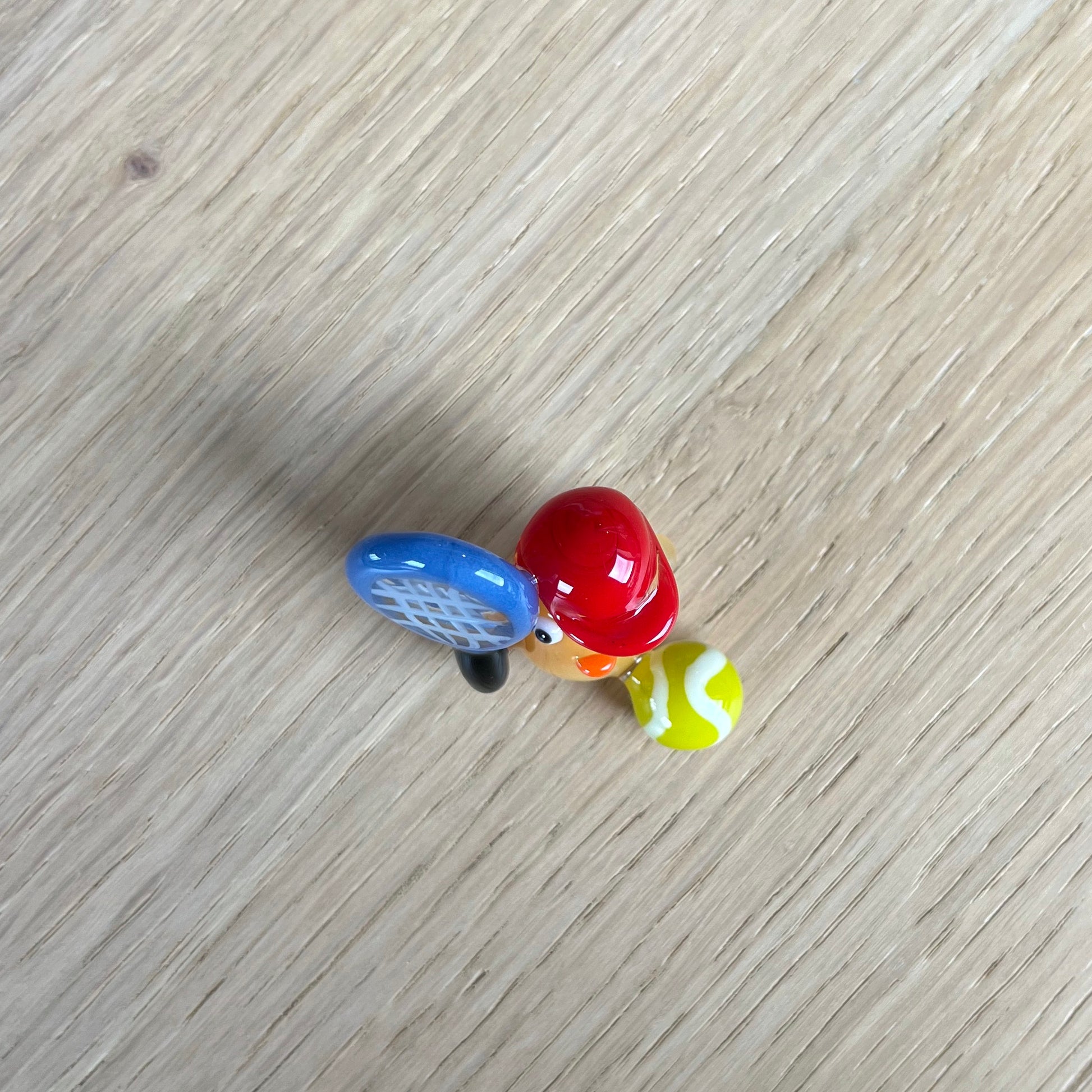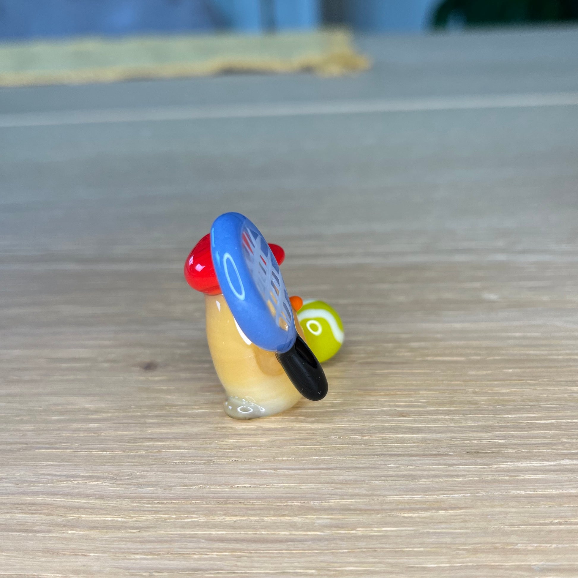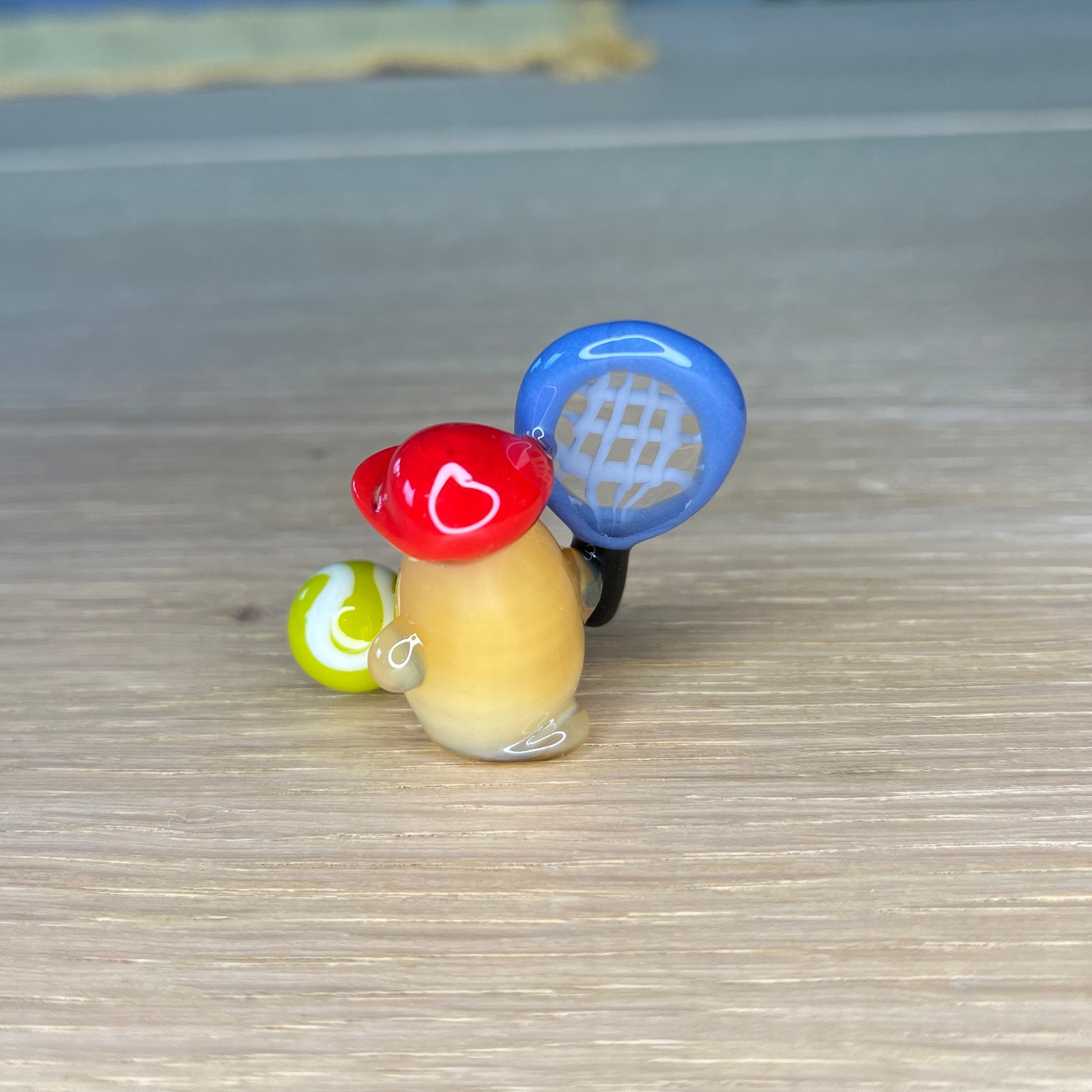 This is a glass figurine of a duck playing tennis for Faith. : )