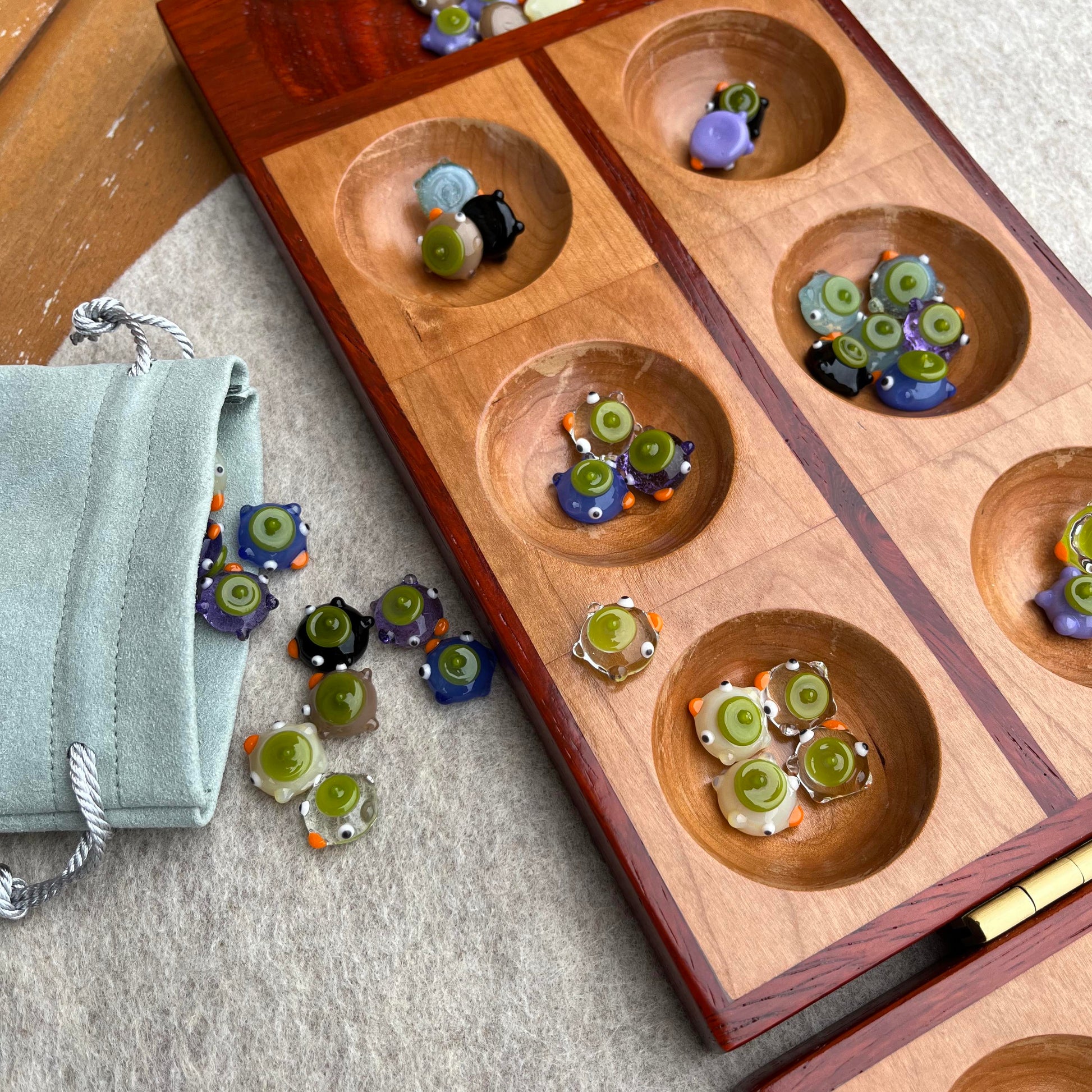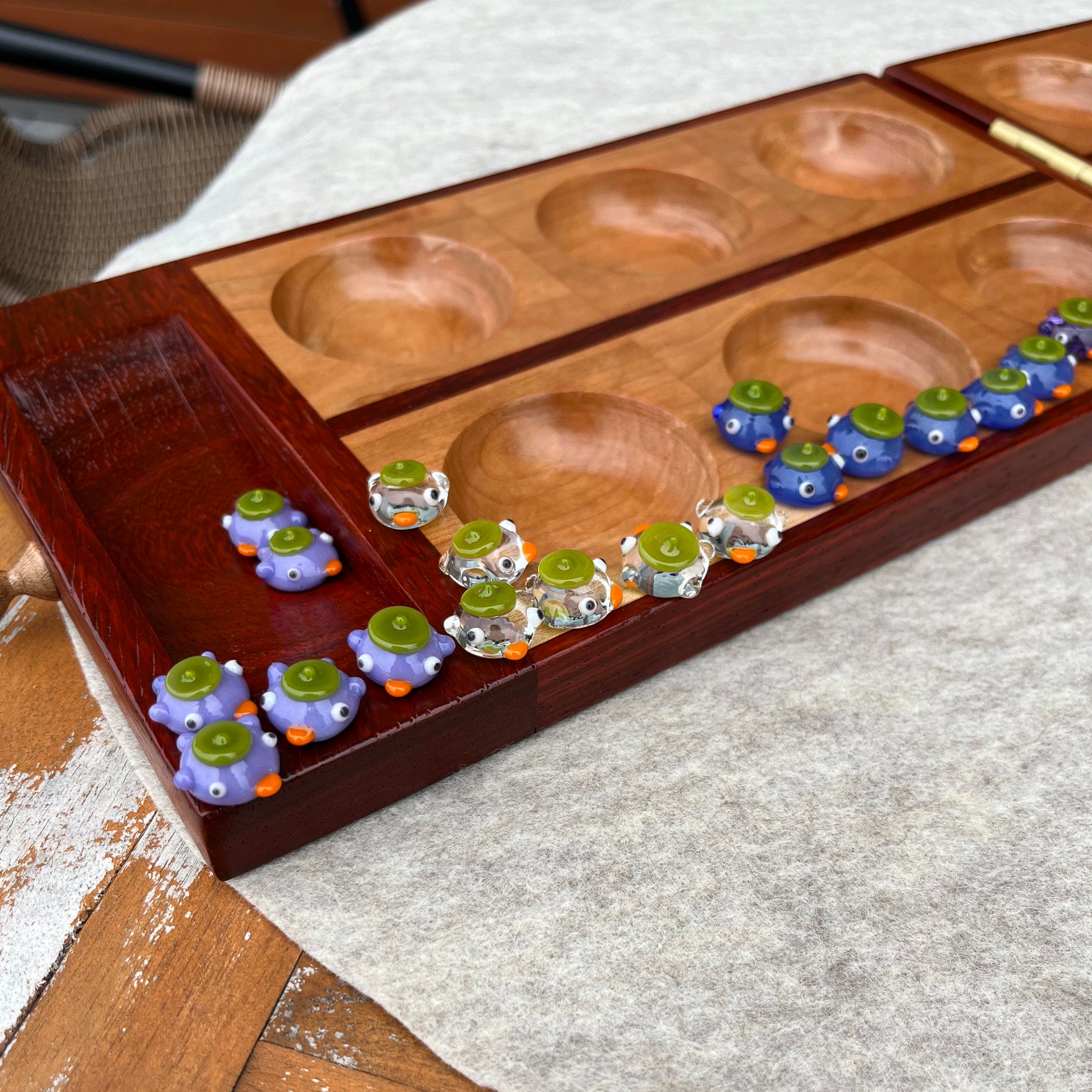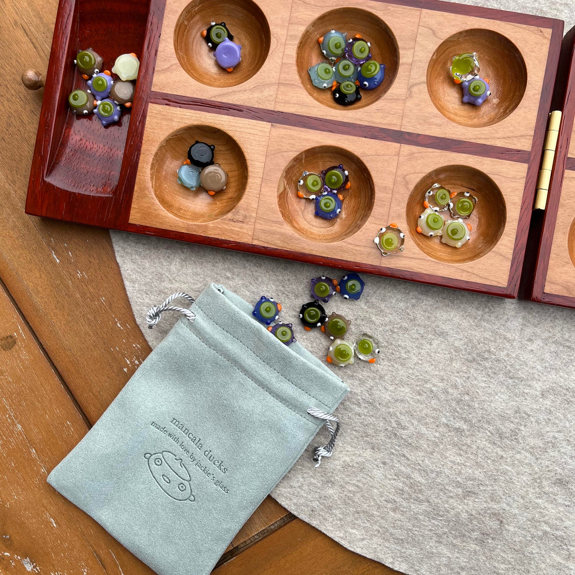 This is a set of 48 small glass ducks for the board game mancala in blues, violets, and earth tones for Melissa. : ) Comes with a bag for pieces (pictured). Board not included.
