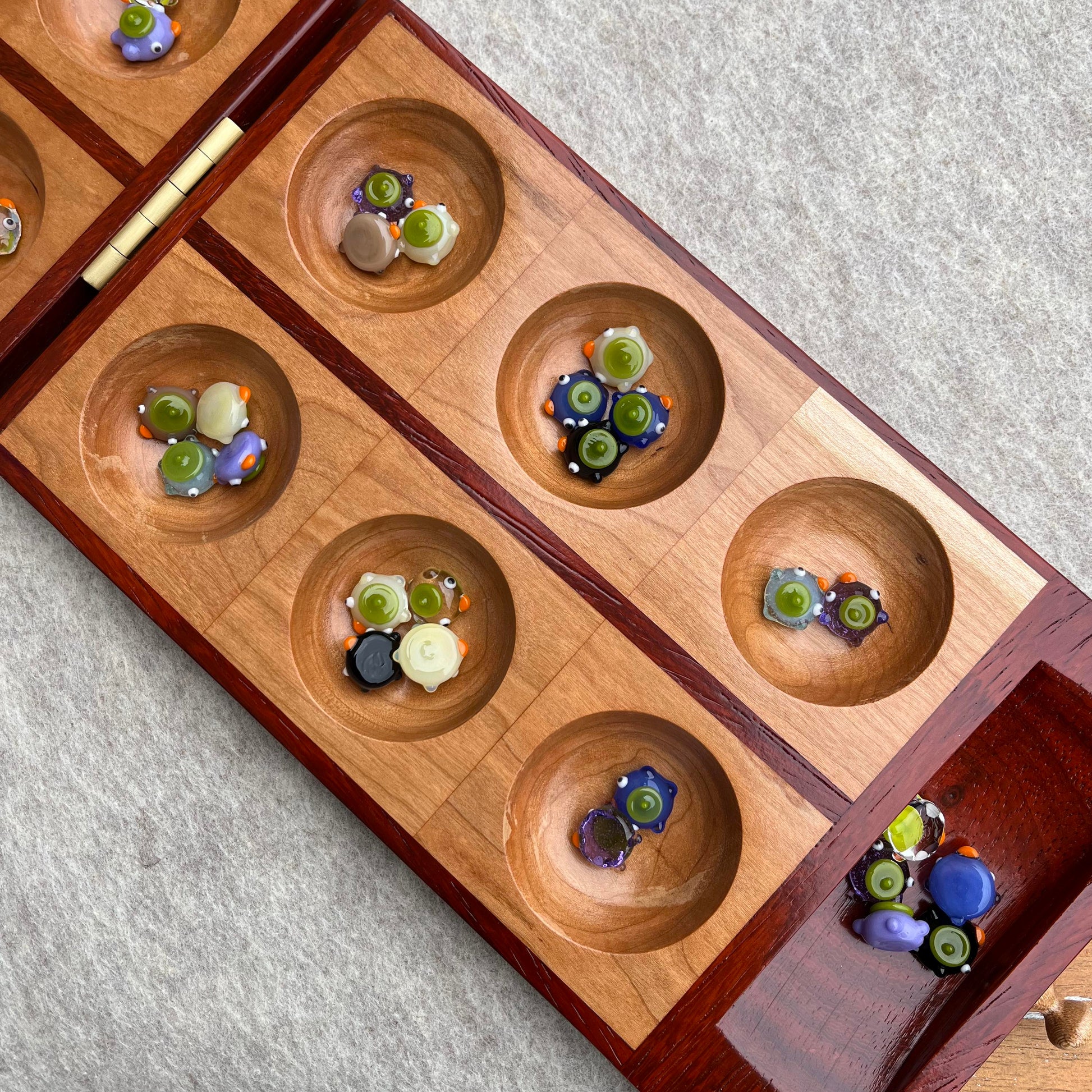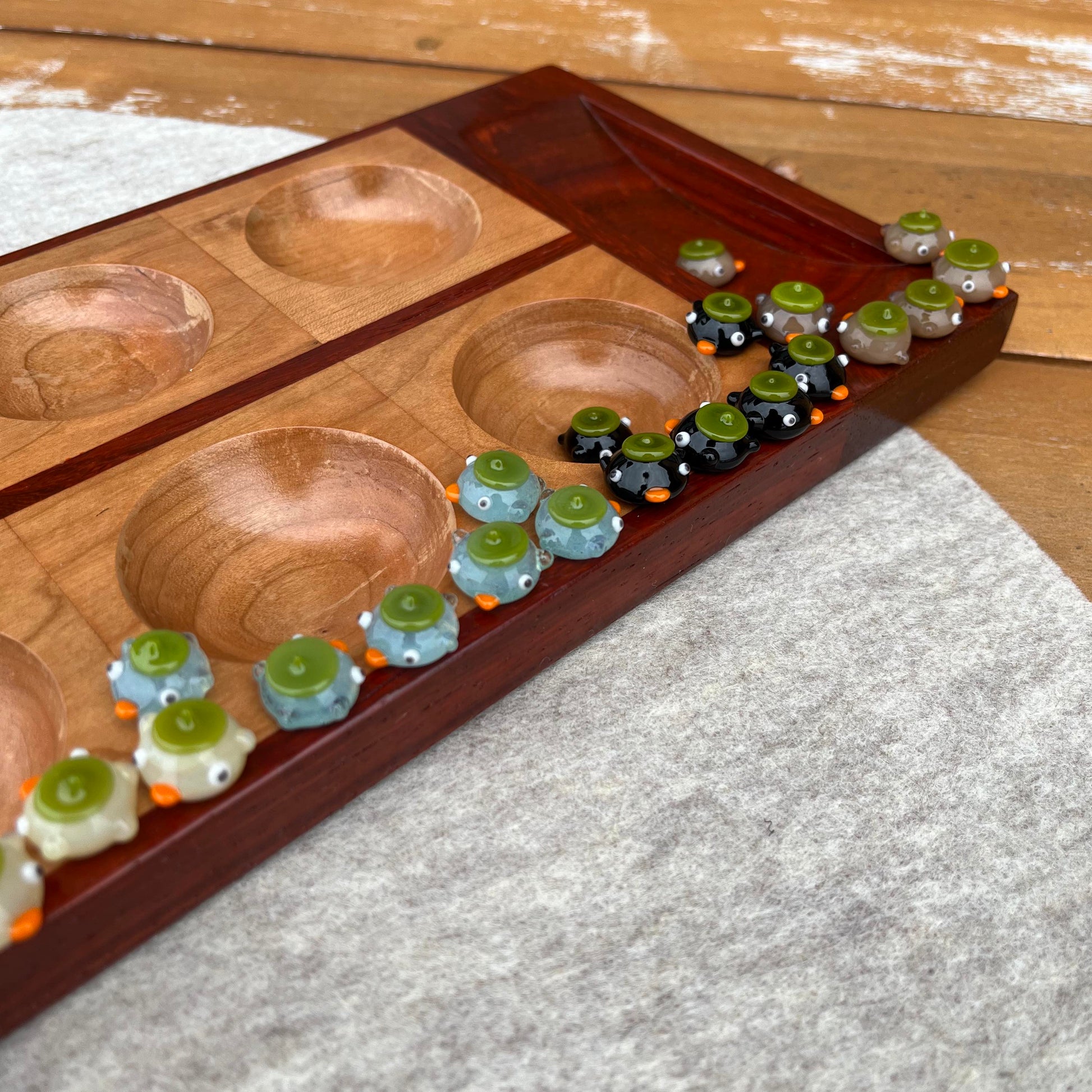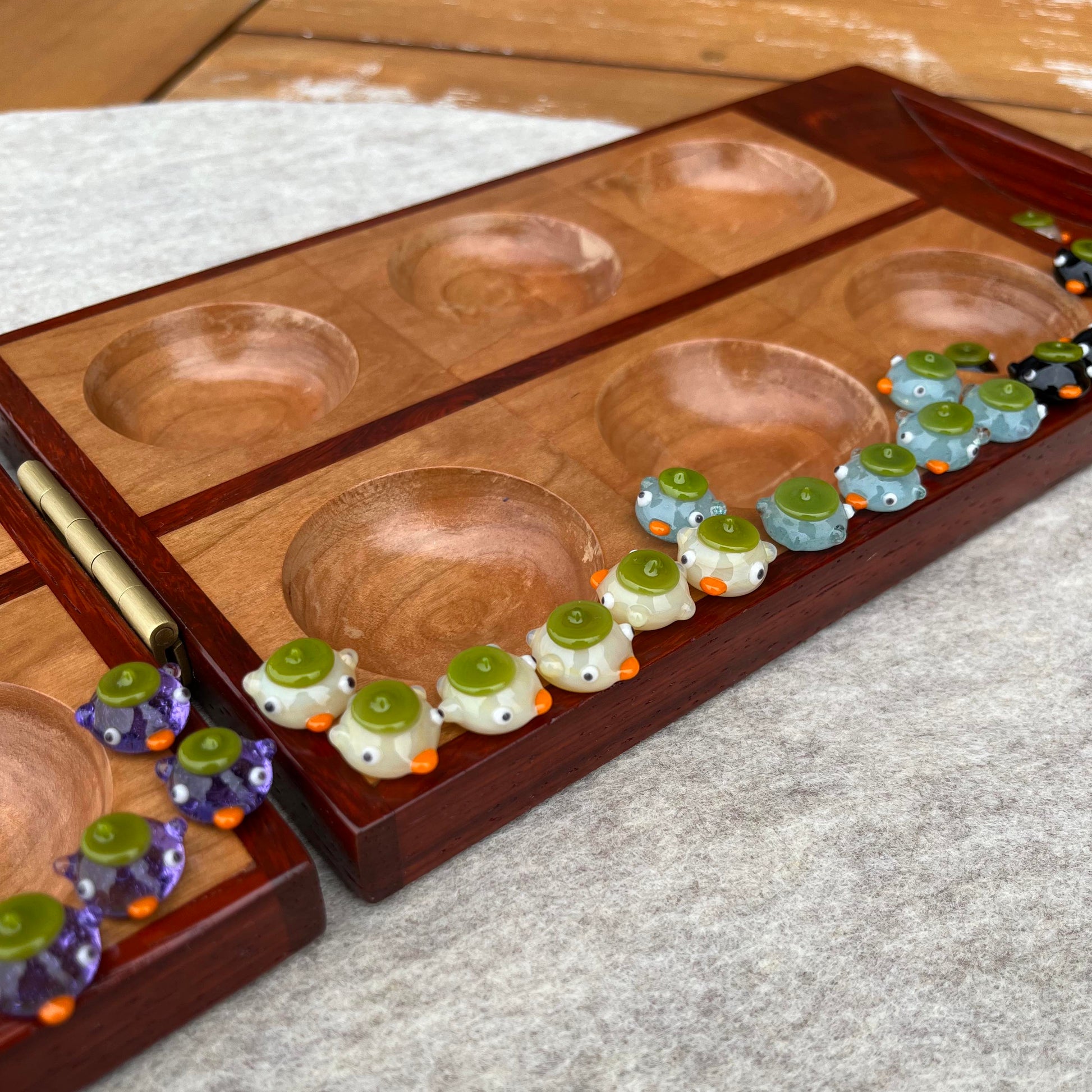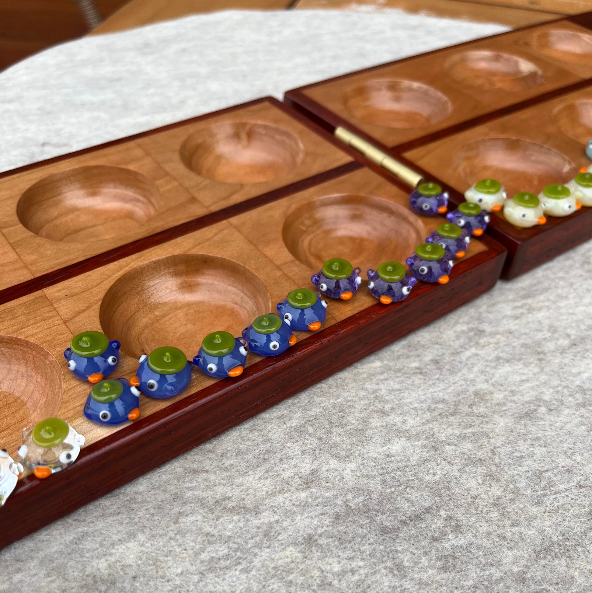 This is a set of 48 small glass ducks for the board game mancala in blues, violets, and earth tones for Melissa. : ) Comes with a bag for pieces (pictured). Board not included.