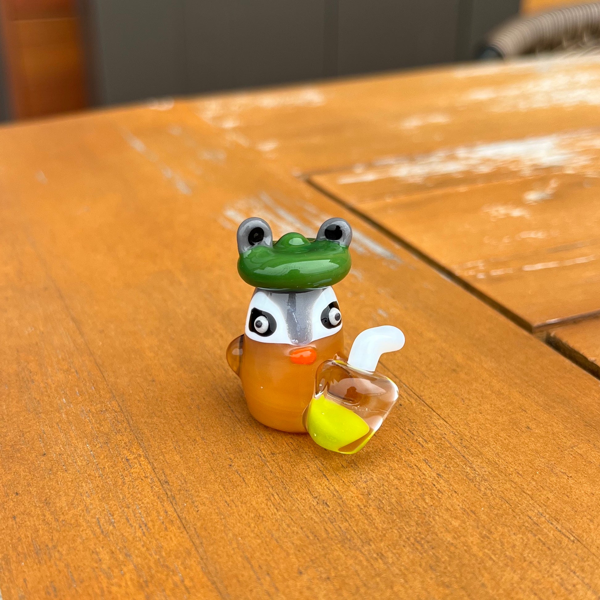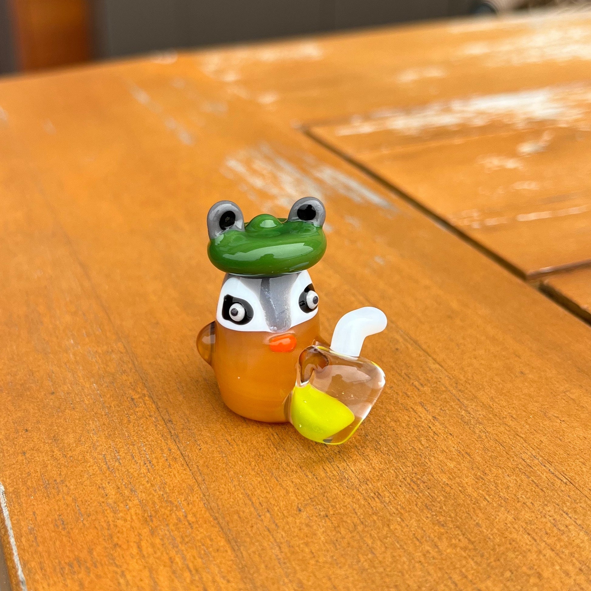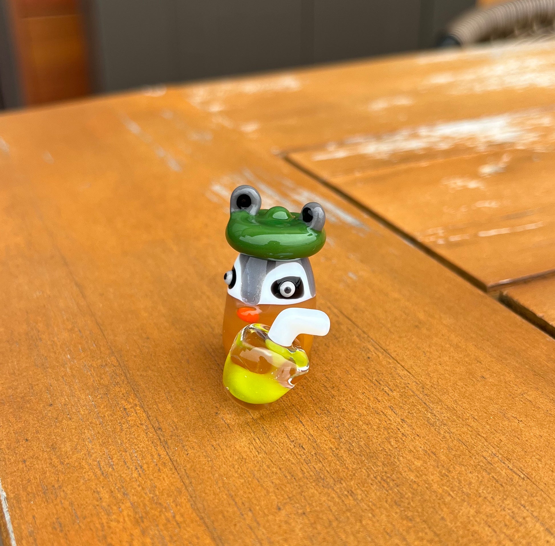 This is a glass figurine of a duck dressed as a raccoon drinking matcha for Natalia. : )