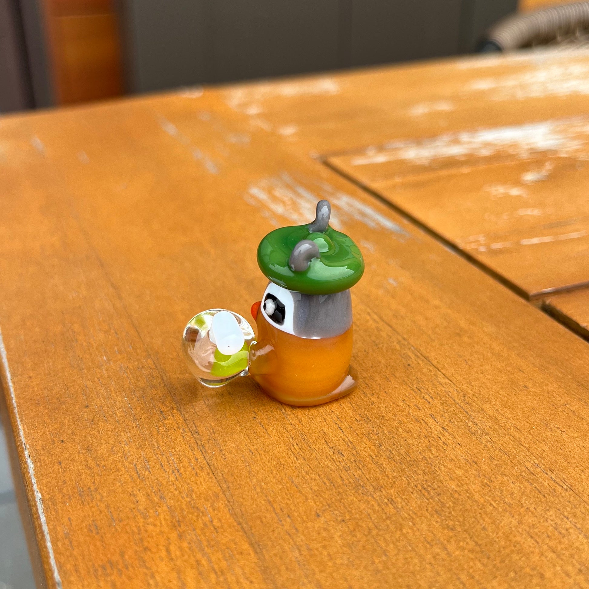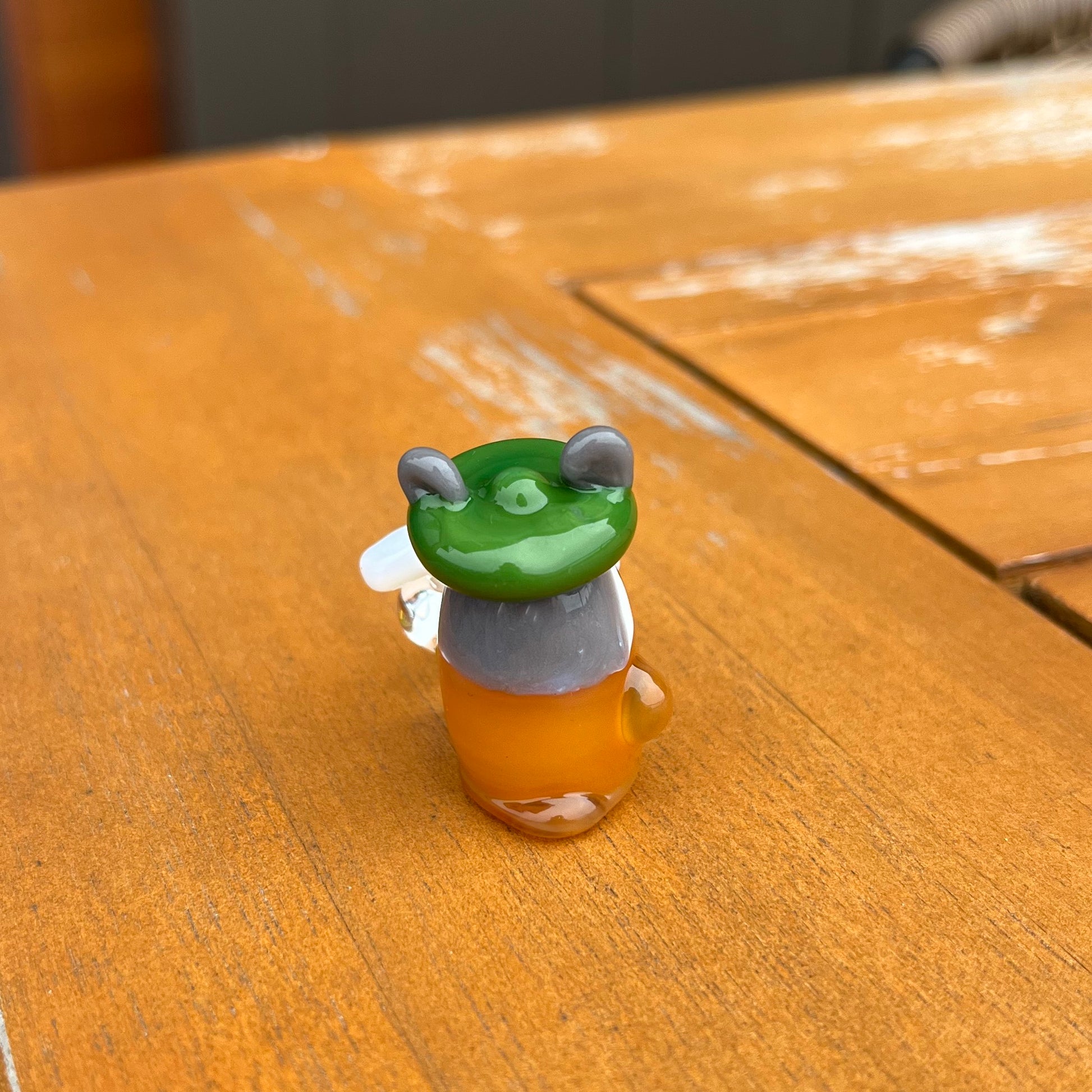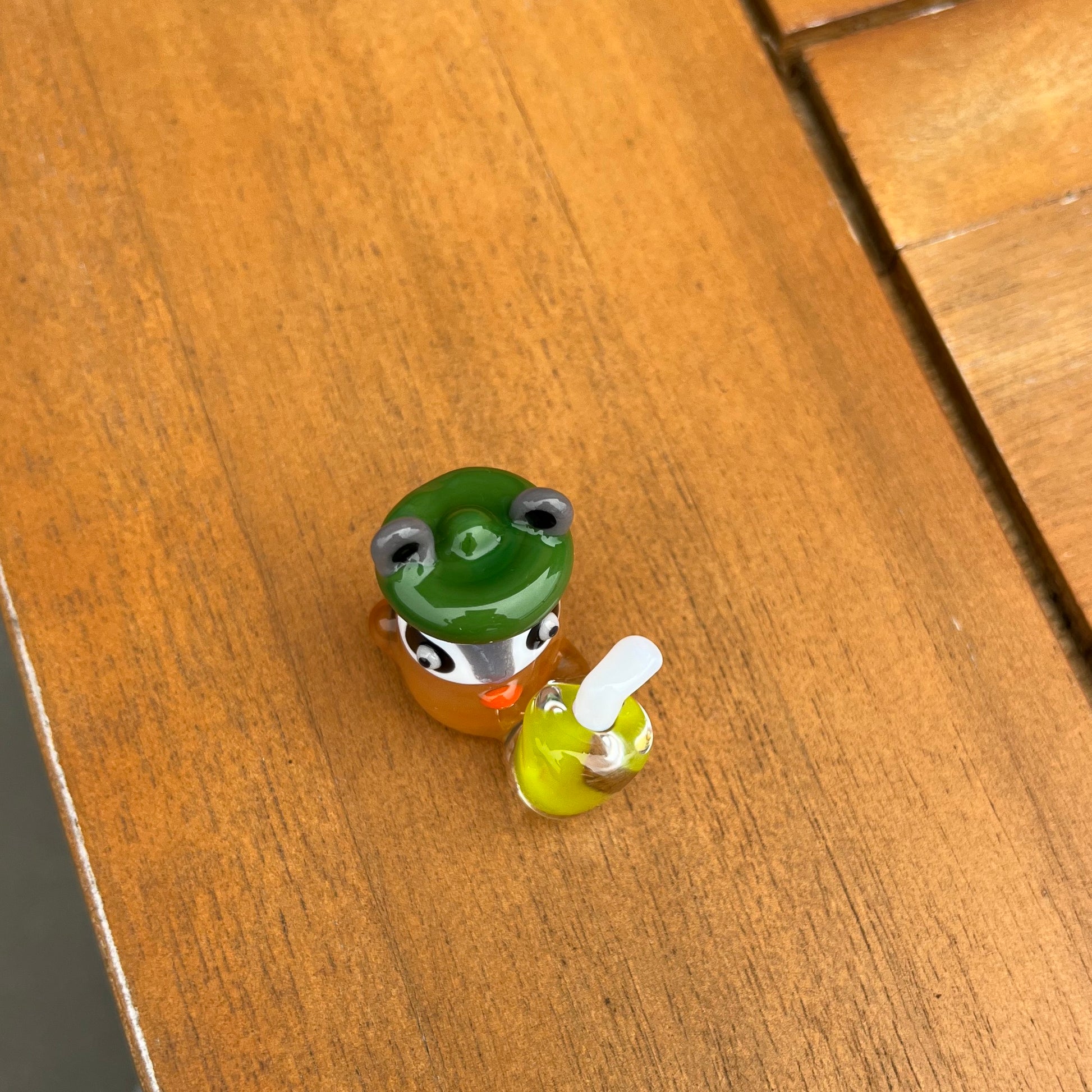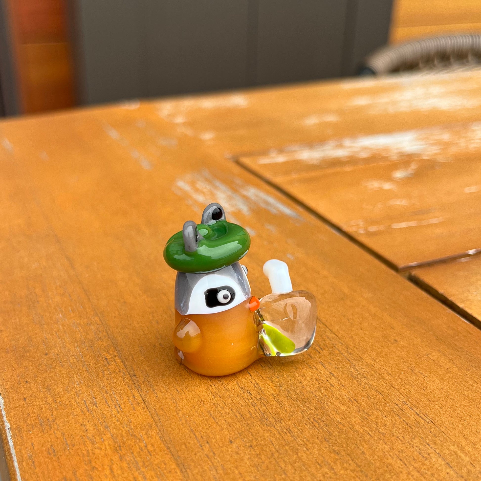 This is a glass figurine of a duck dressed as a raccoon drinking matcha for Natalia. : )