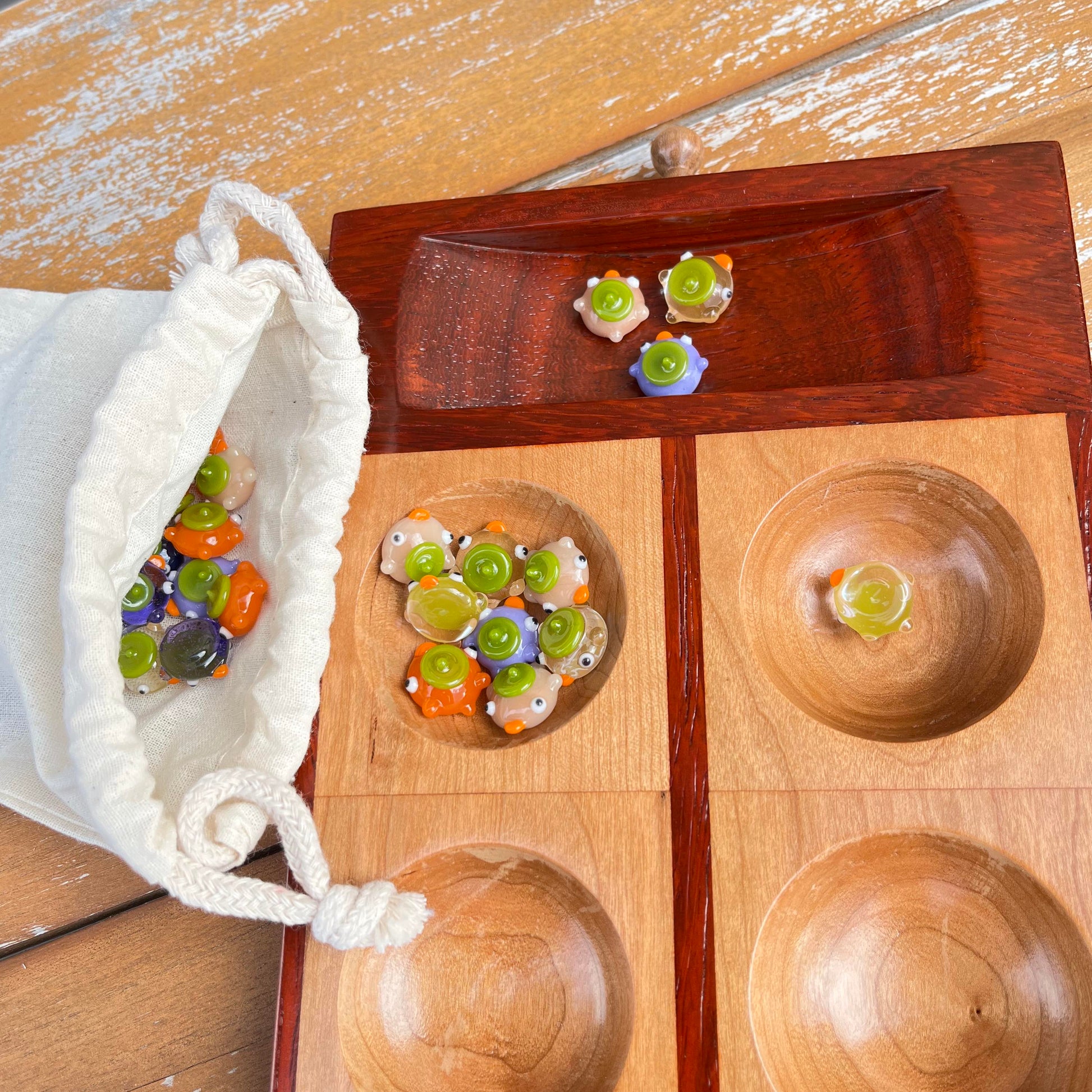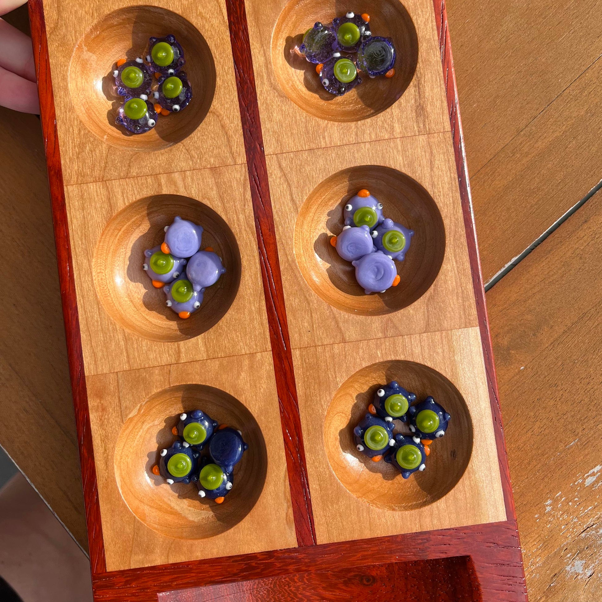 This is a set of 48 small glass ducks for the board game mancala in blues, violets, and oranges for Sarah. : ) Comes with a bag for pieces (similar bag is pictured). Board not included.