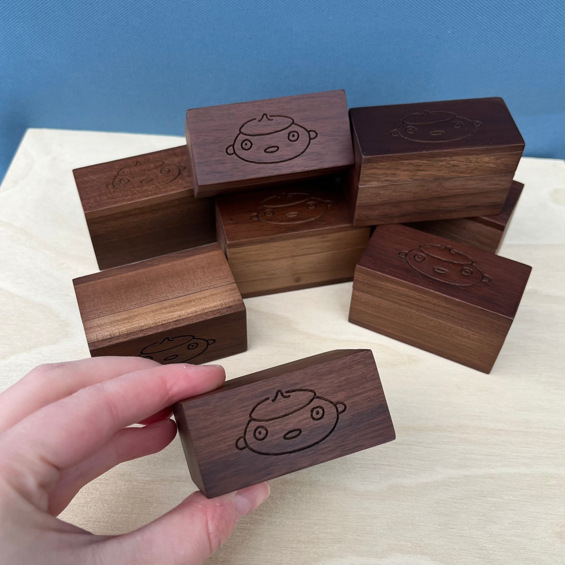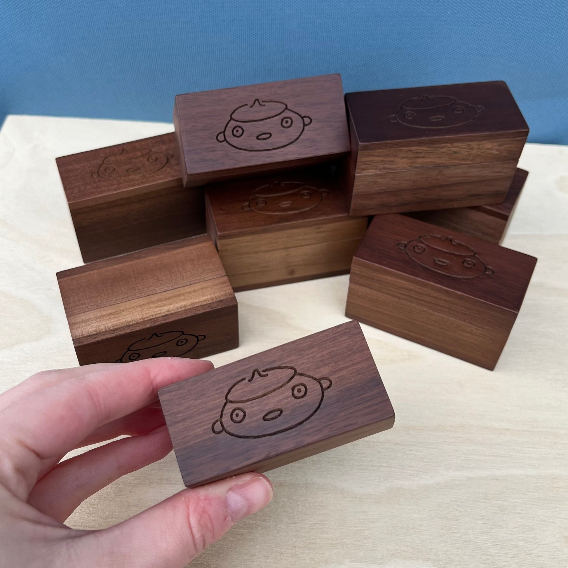 Walnut boxes approximately 2.5 in long x 1.25 in wide x 1.5 in height (outer dimensions)