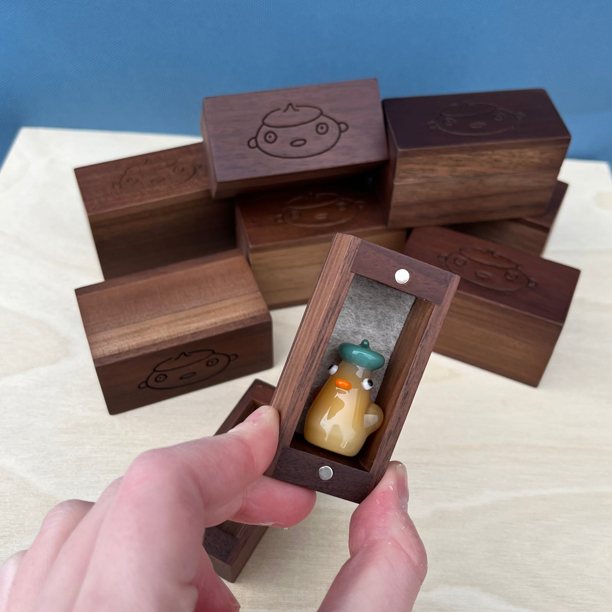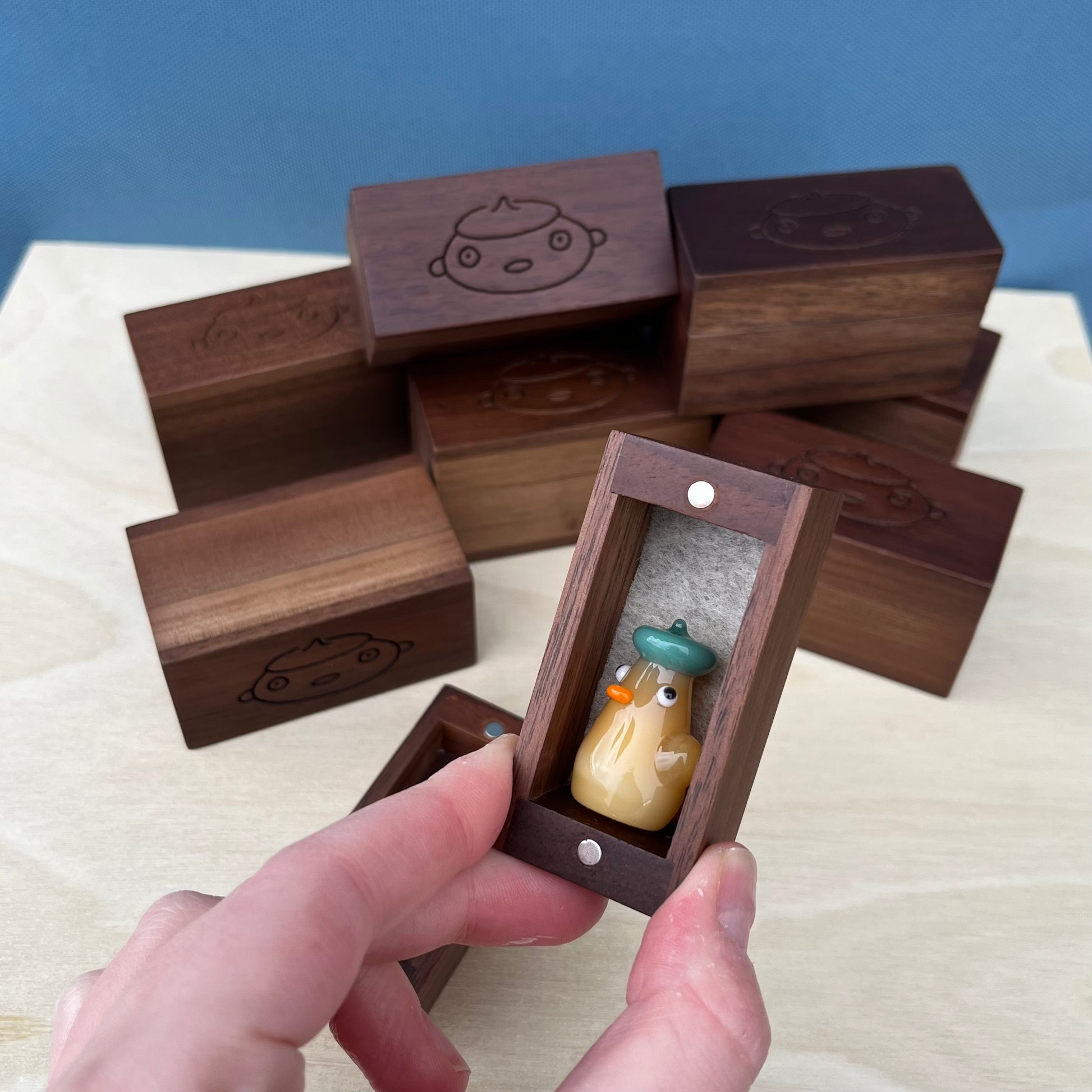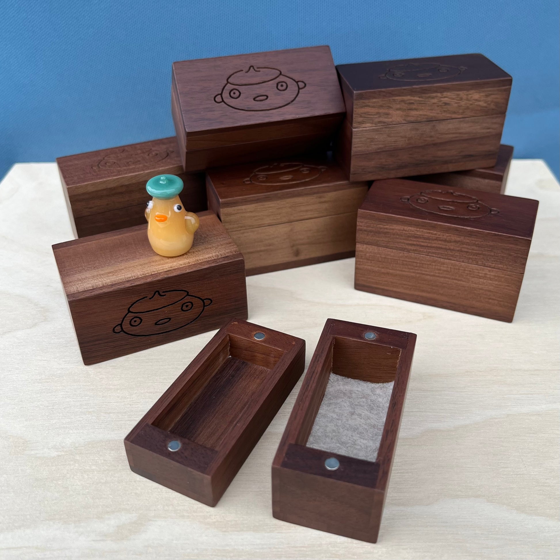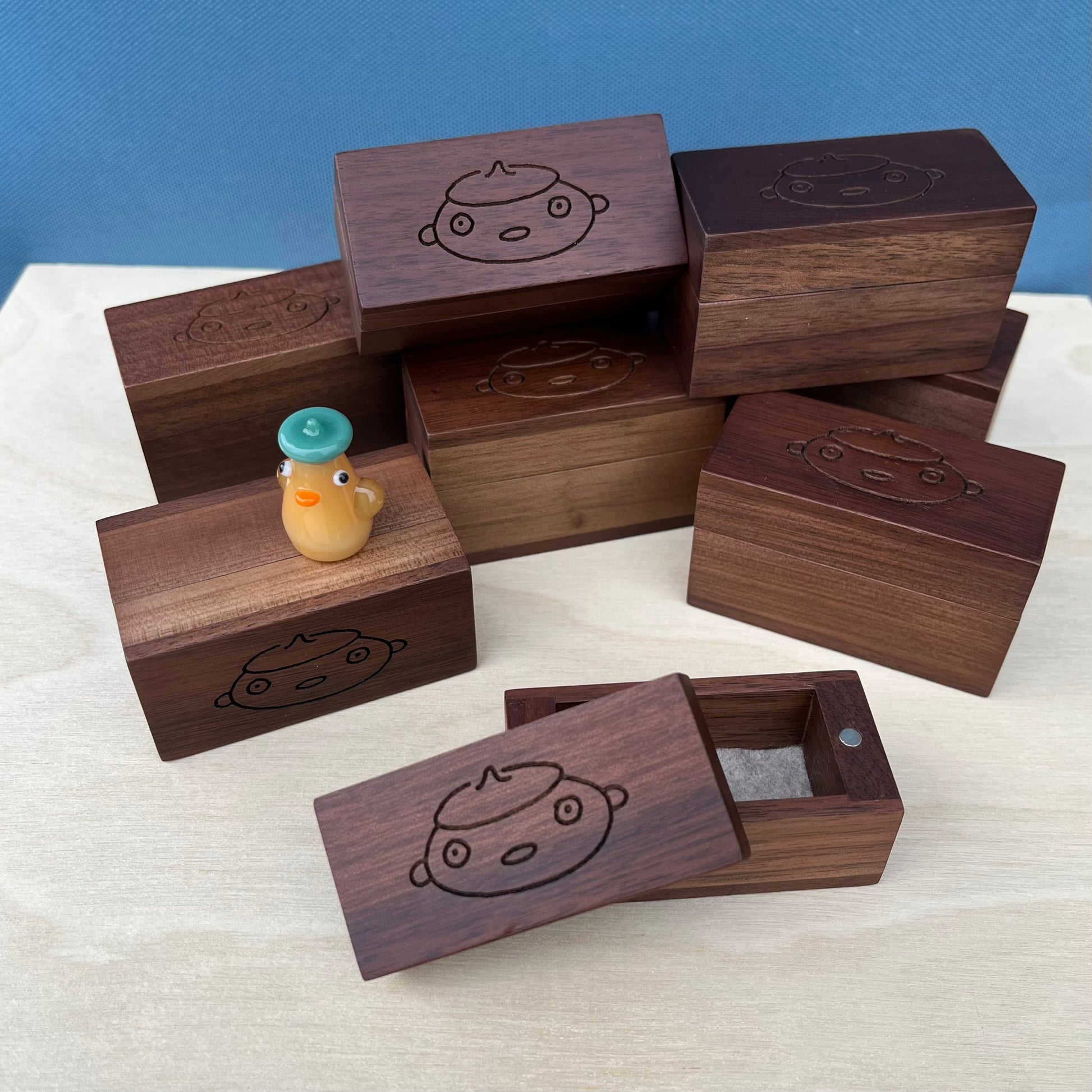These are wooden duck gift boxes with felt on the inside bottom surface and magnet closures. These boxes are perfect to keep your duckie cozy or to gift to a loved one!