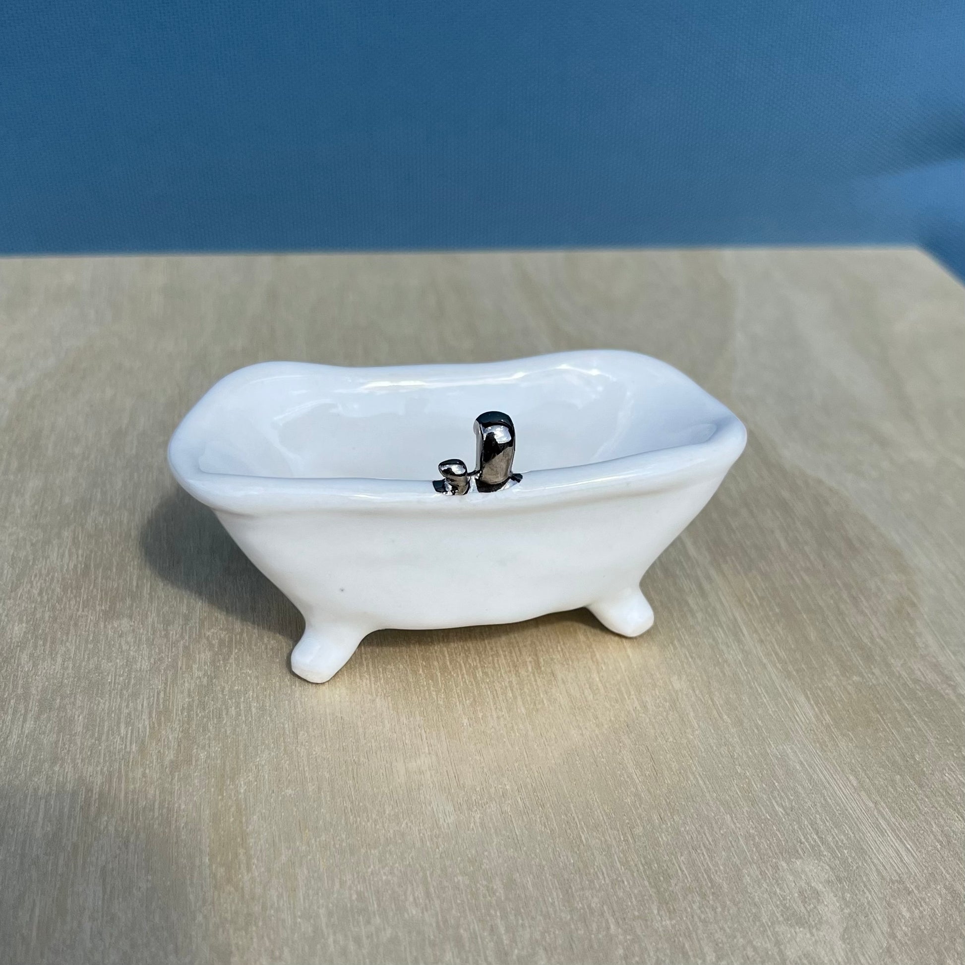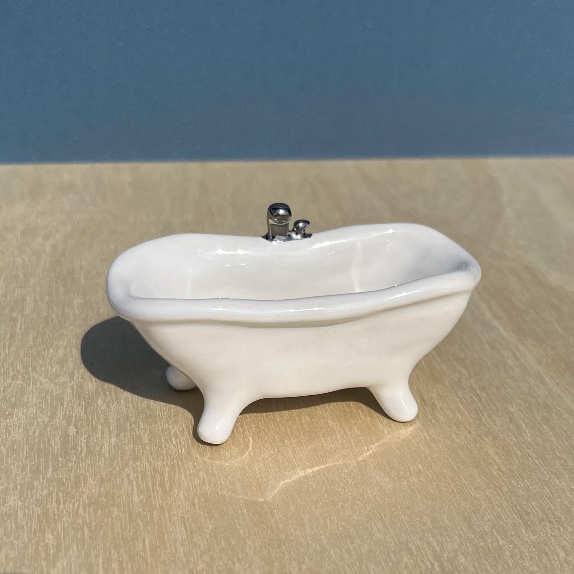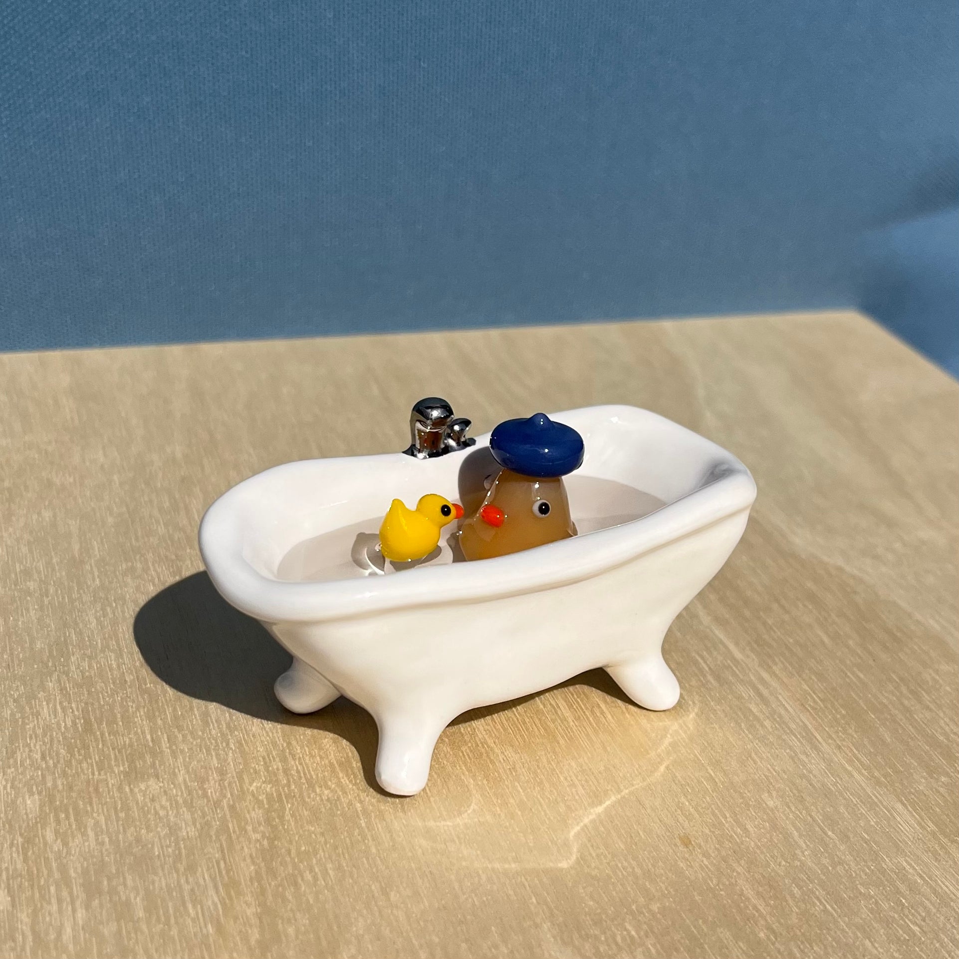 Jenni Liu is a lifelong Seattleite who took her first pottery class in 2019 and after a bit of a rough start, fell in love with the medium. She enjoys making cheerful functional pieces, including ducks, eggs, potatoes, and other food themed pieces. She recently started playing around with making miniatures, including the bathtub in this collaboration.