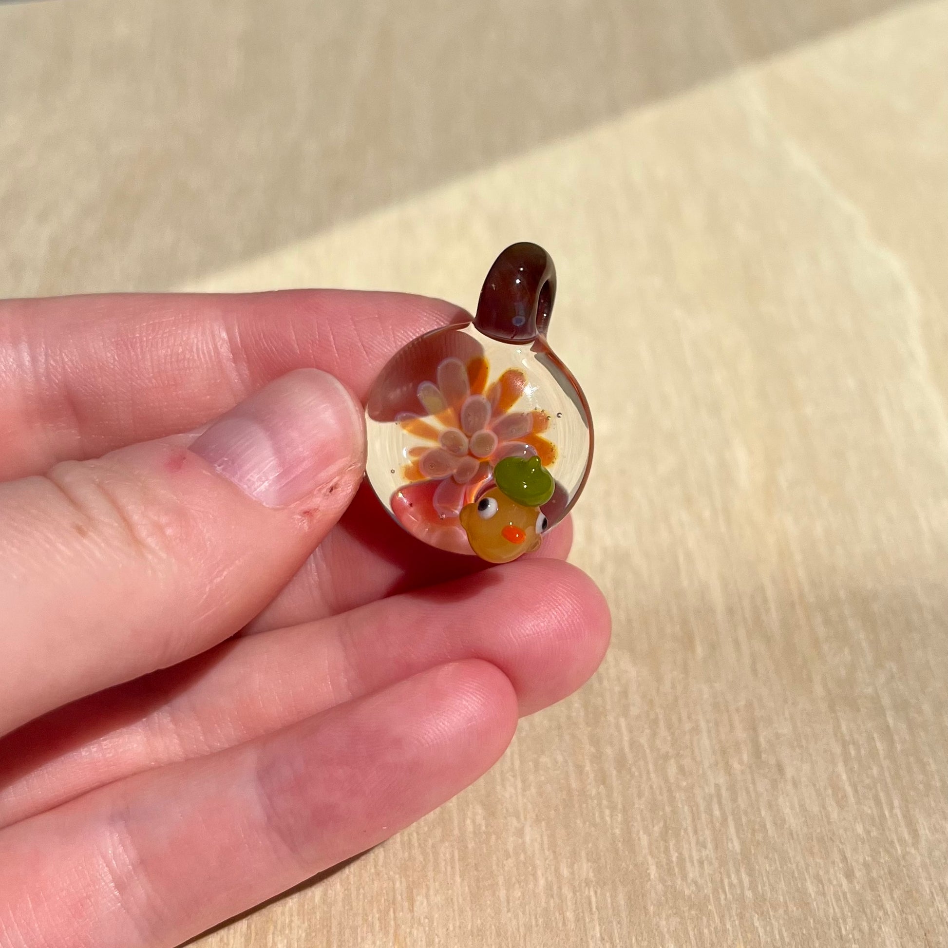 Malcolm is a skilled glassworker in Seattle, making both large vessels in the hot shop and intricate pendants on the torch. He drew silver-based color designs by hand in these pendants and gave them to me to add cute duckies to them. Malcolm has been making pendants for years and they're very sturdy, so I love these as my first jewelry offering in the duckie shop : )