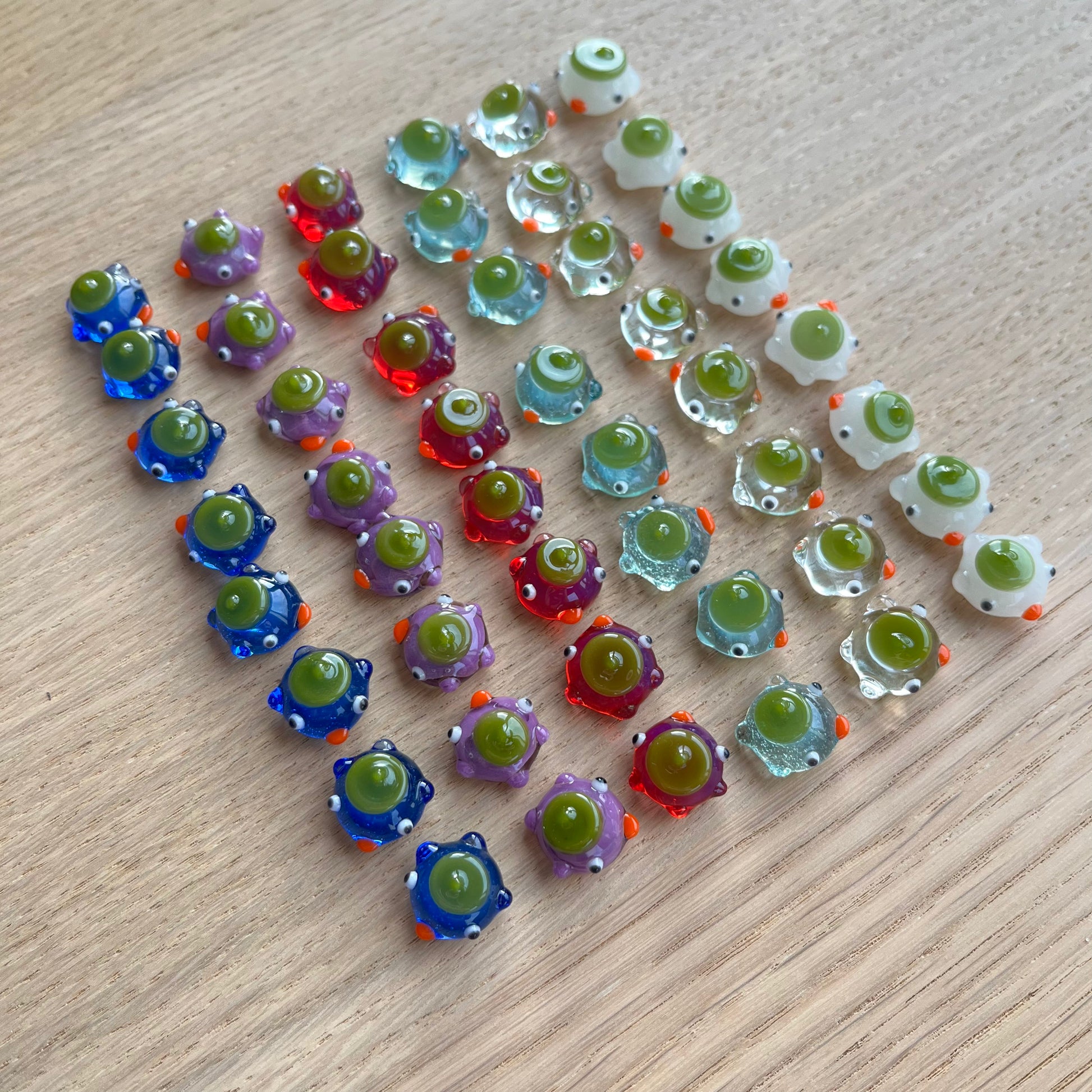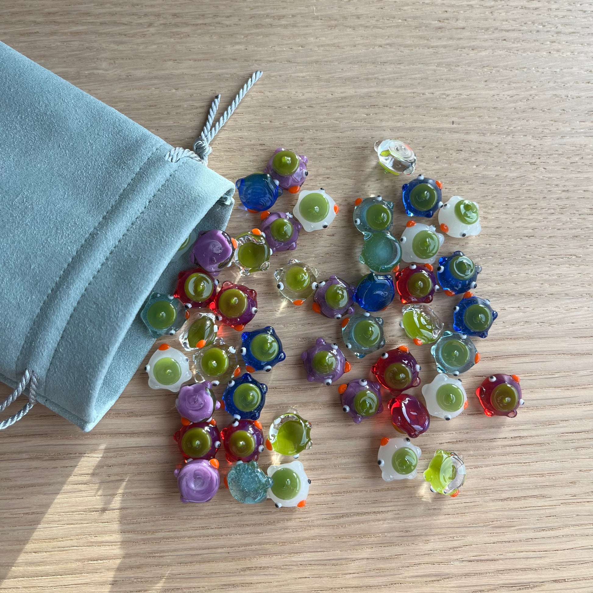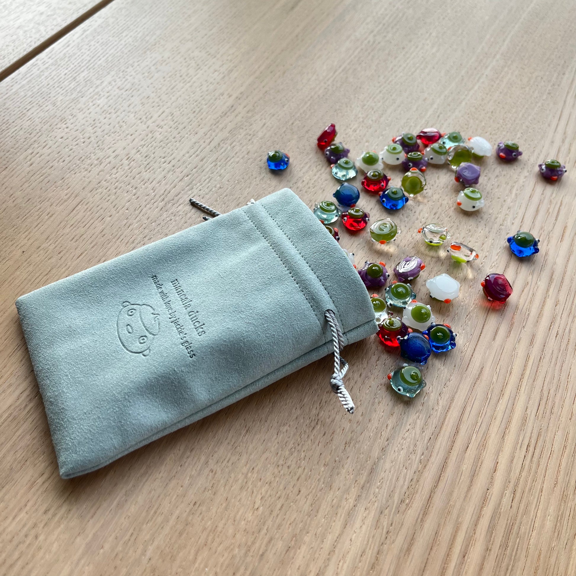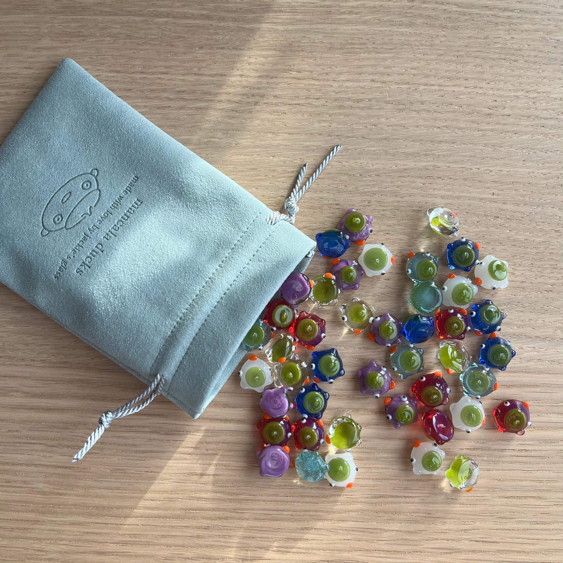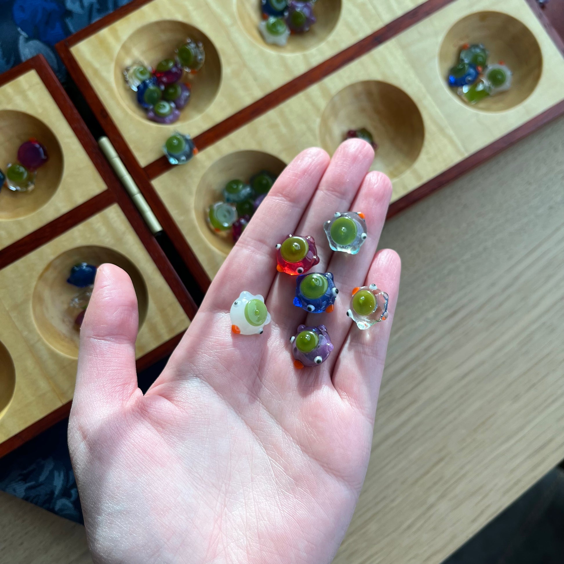 This is a set of 48 small glass ducks for the board game mancala in blues, violet, white, clear, and magenta. : )