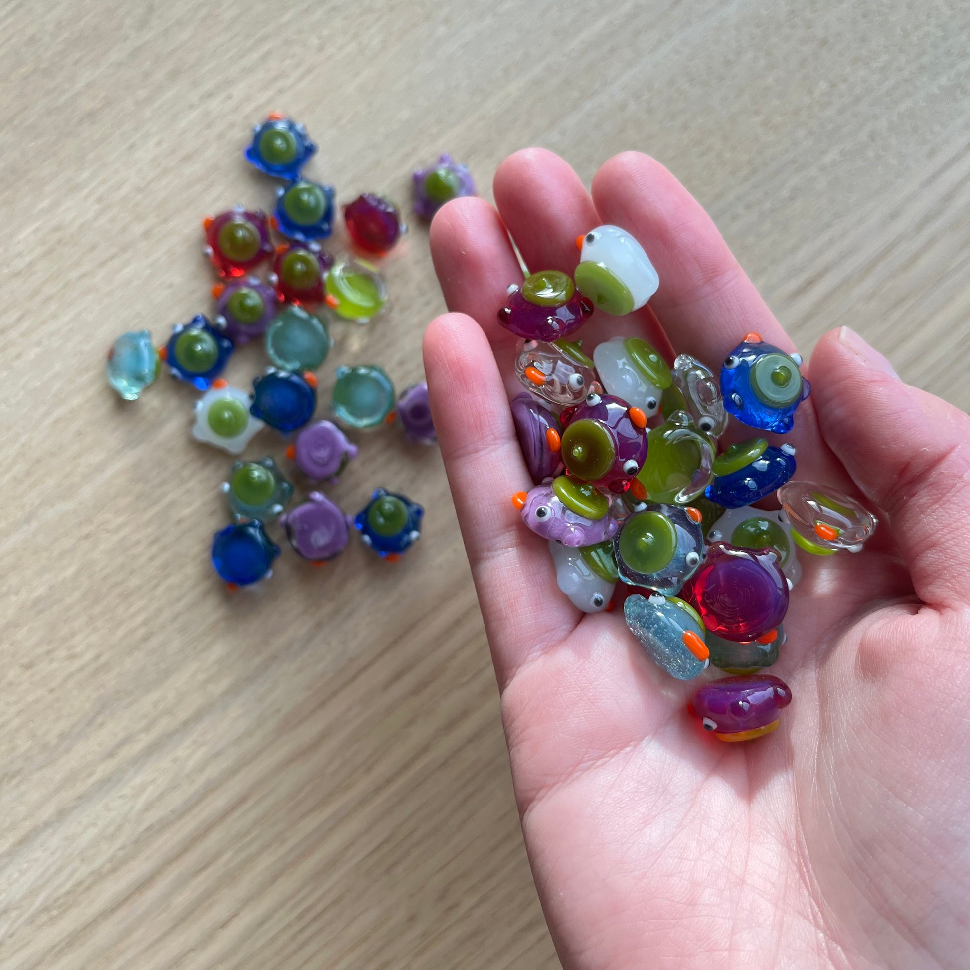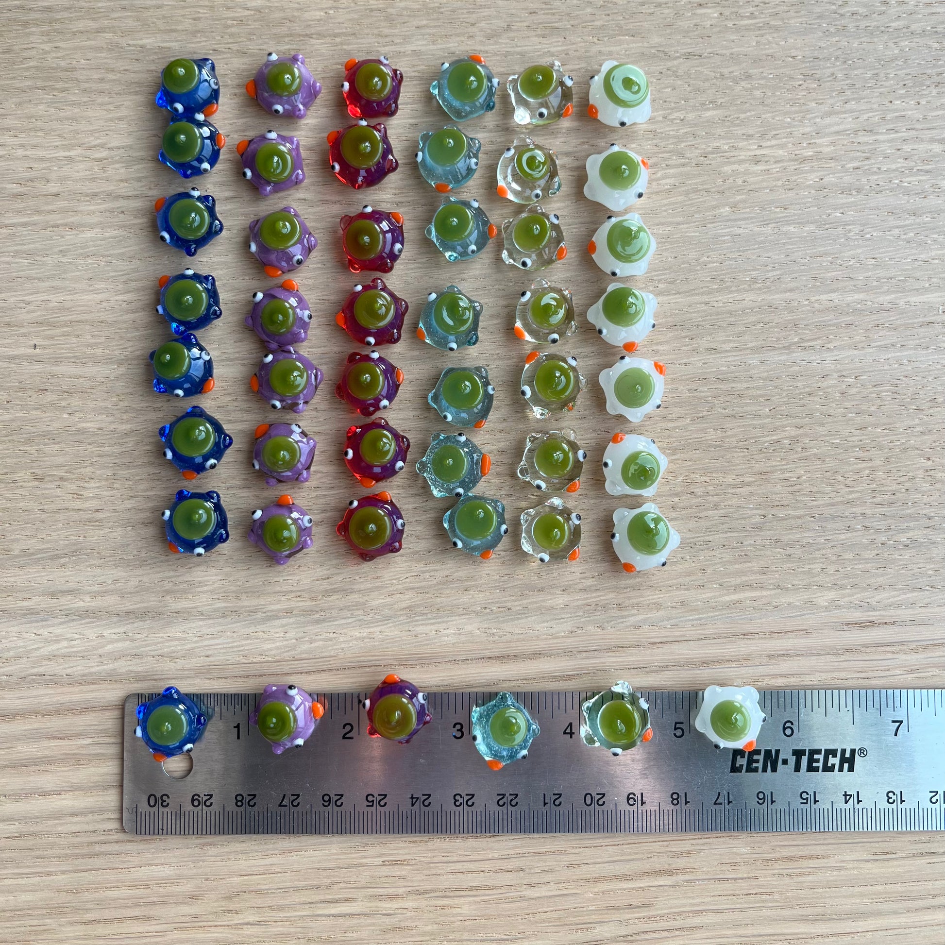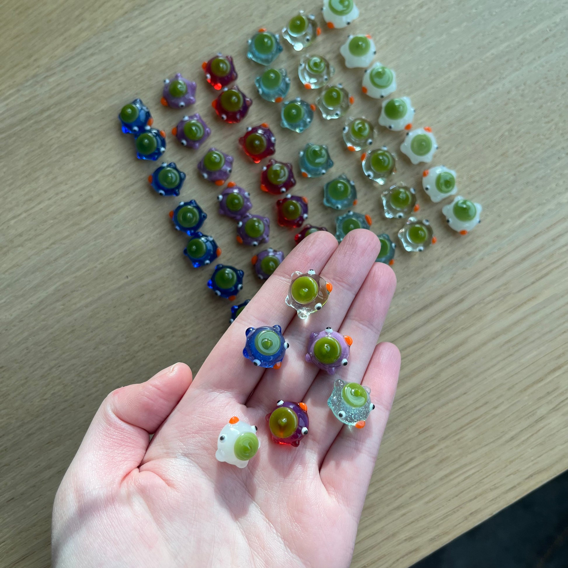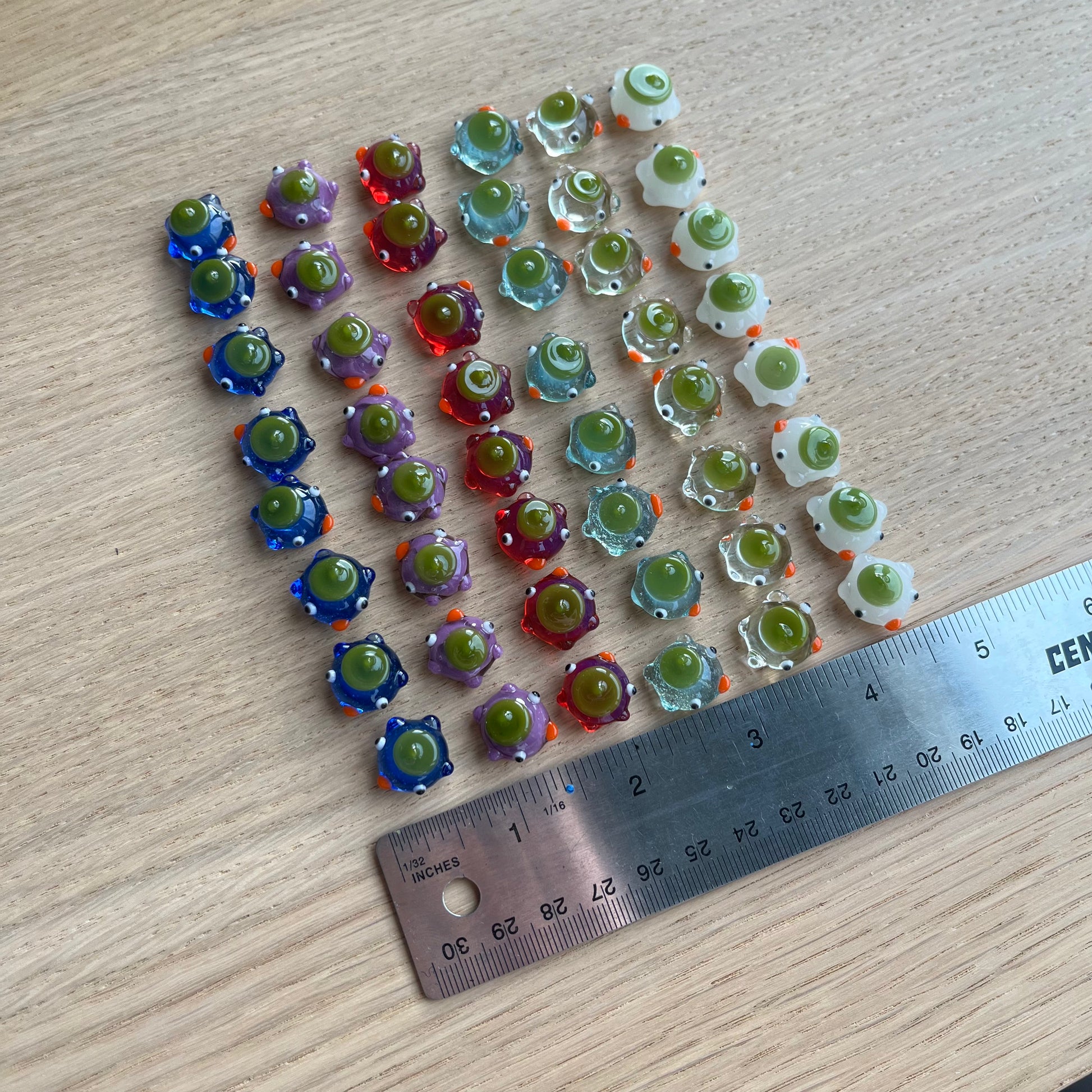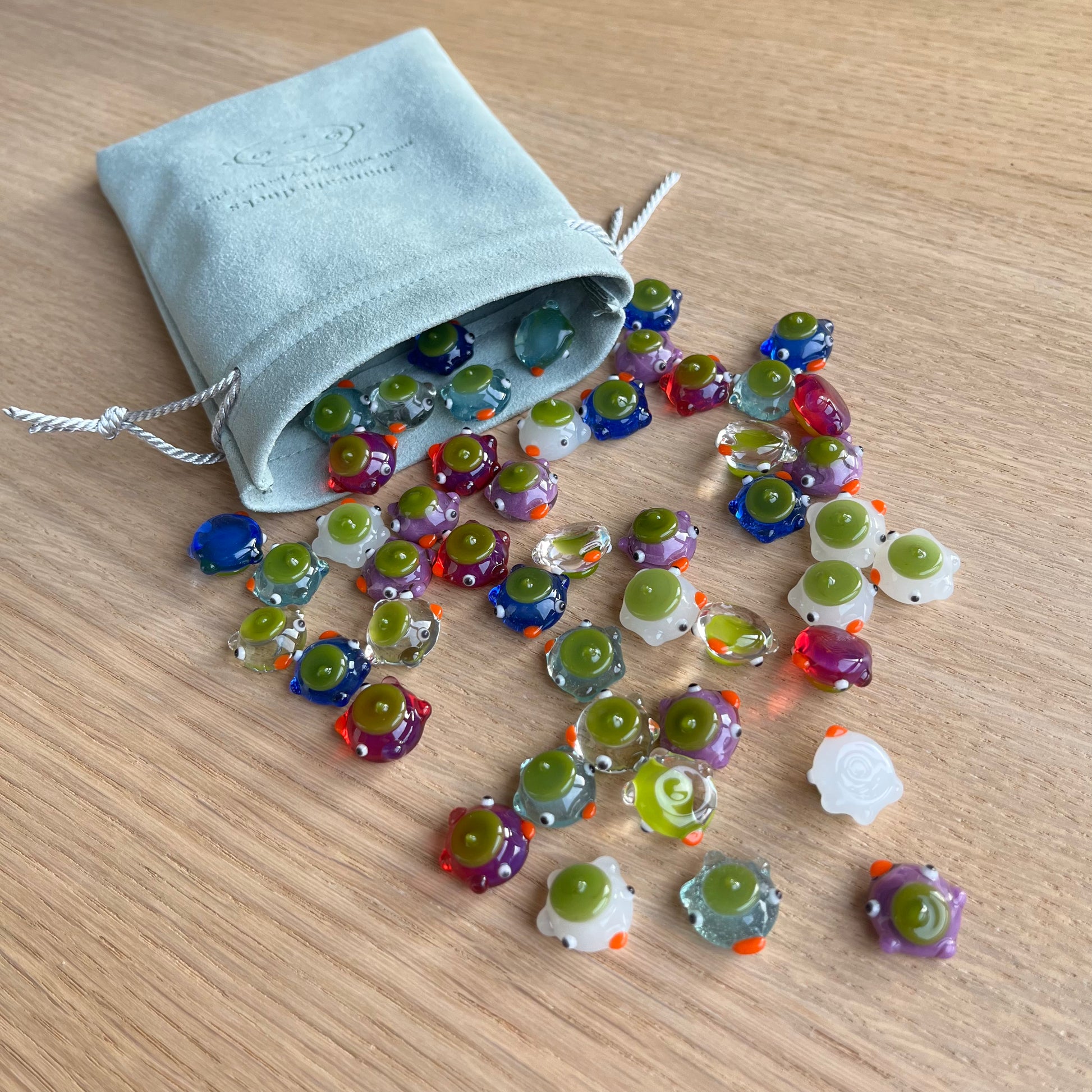 This is a set of 48 small glass ducks for the board game mancala in blues, violet, white, clear, and magenta. : )