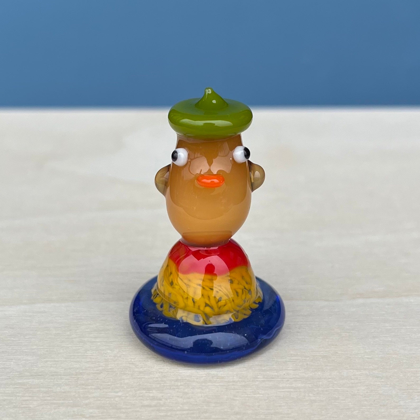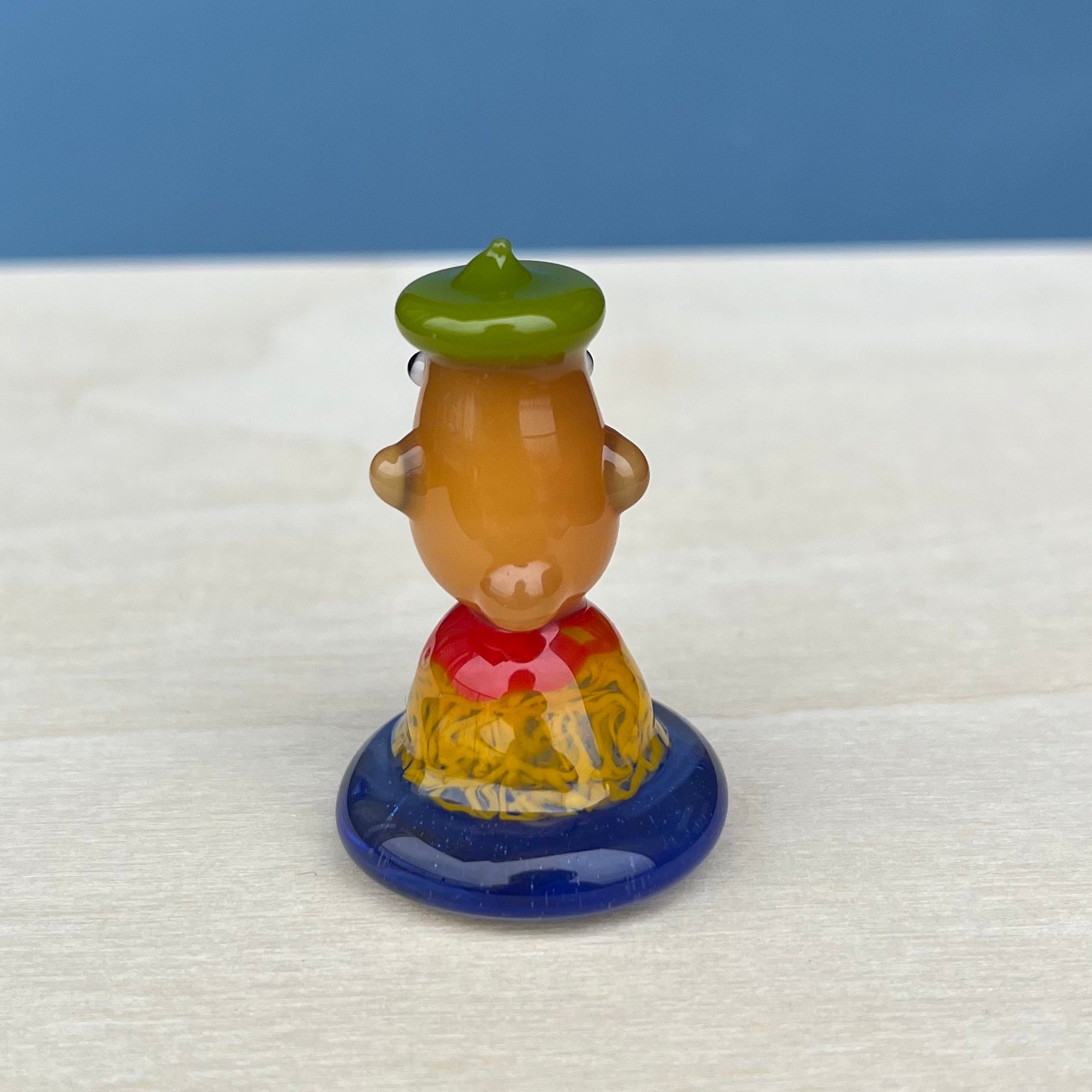 This is a glass figurine of a duck on a bowl of spaghetti with tomato sauce. : )