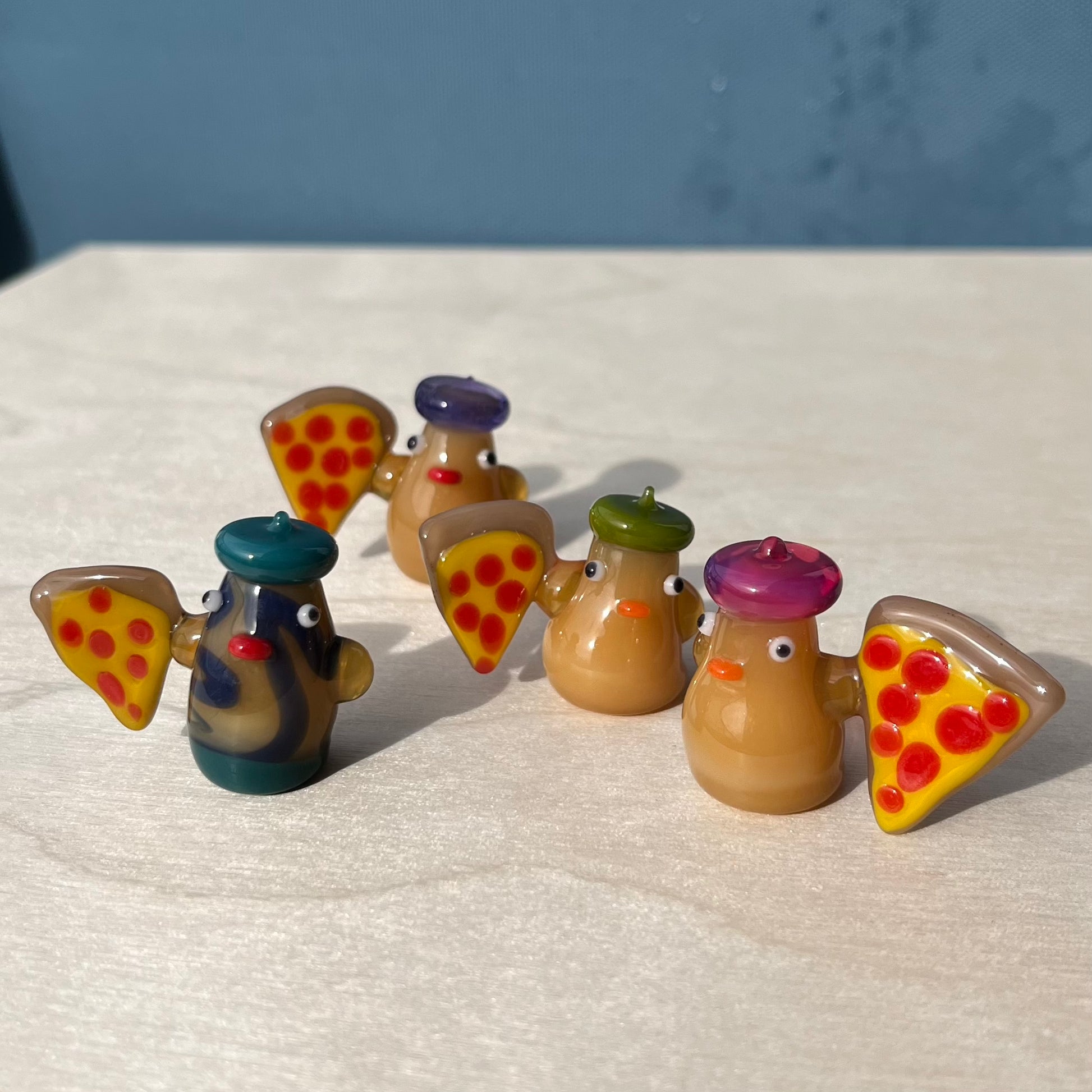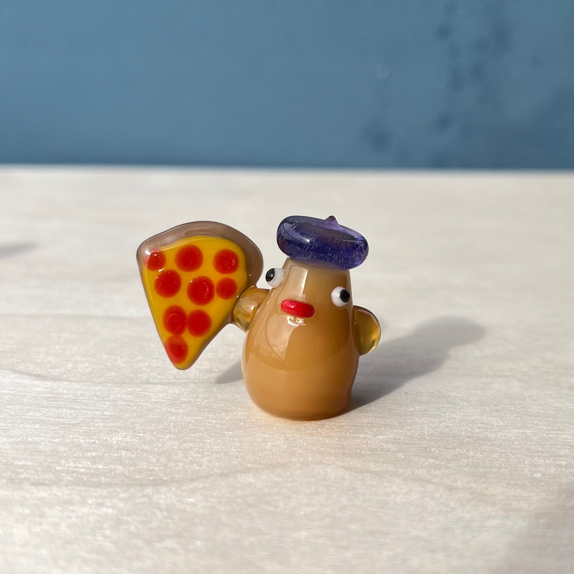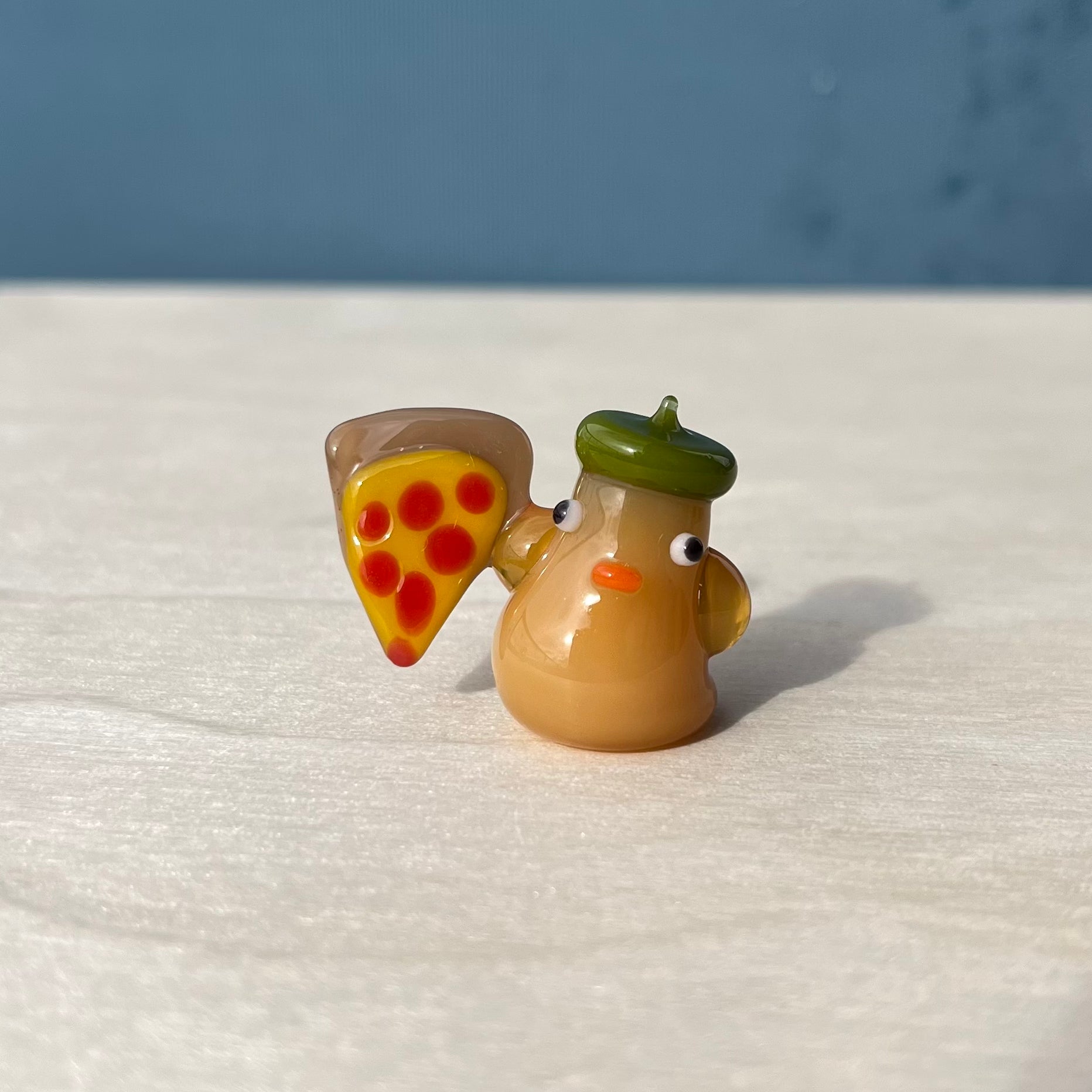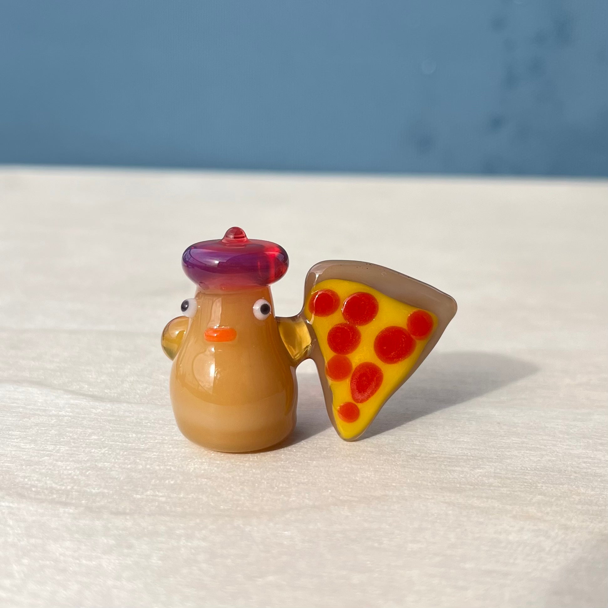 This is a glass figurine of a duck with pizza. Little duckie wants you to have a slice! : )