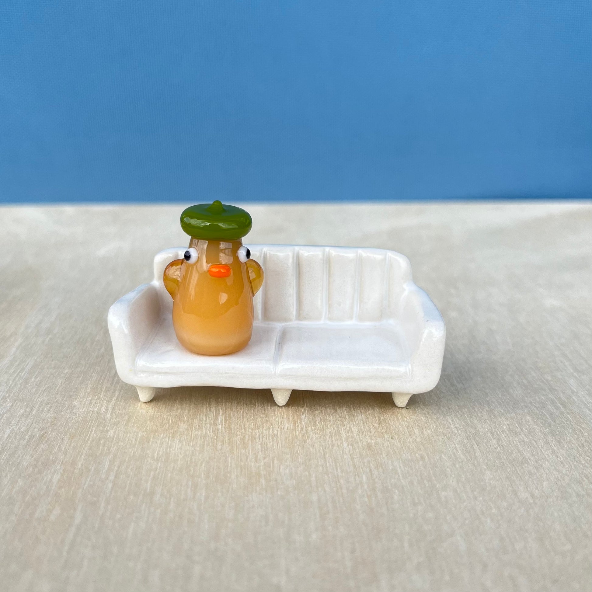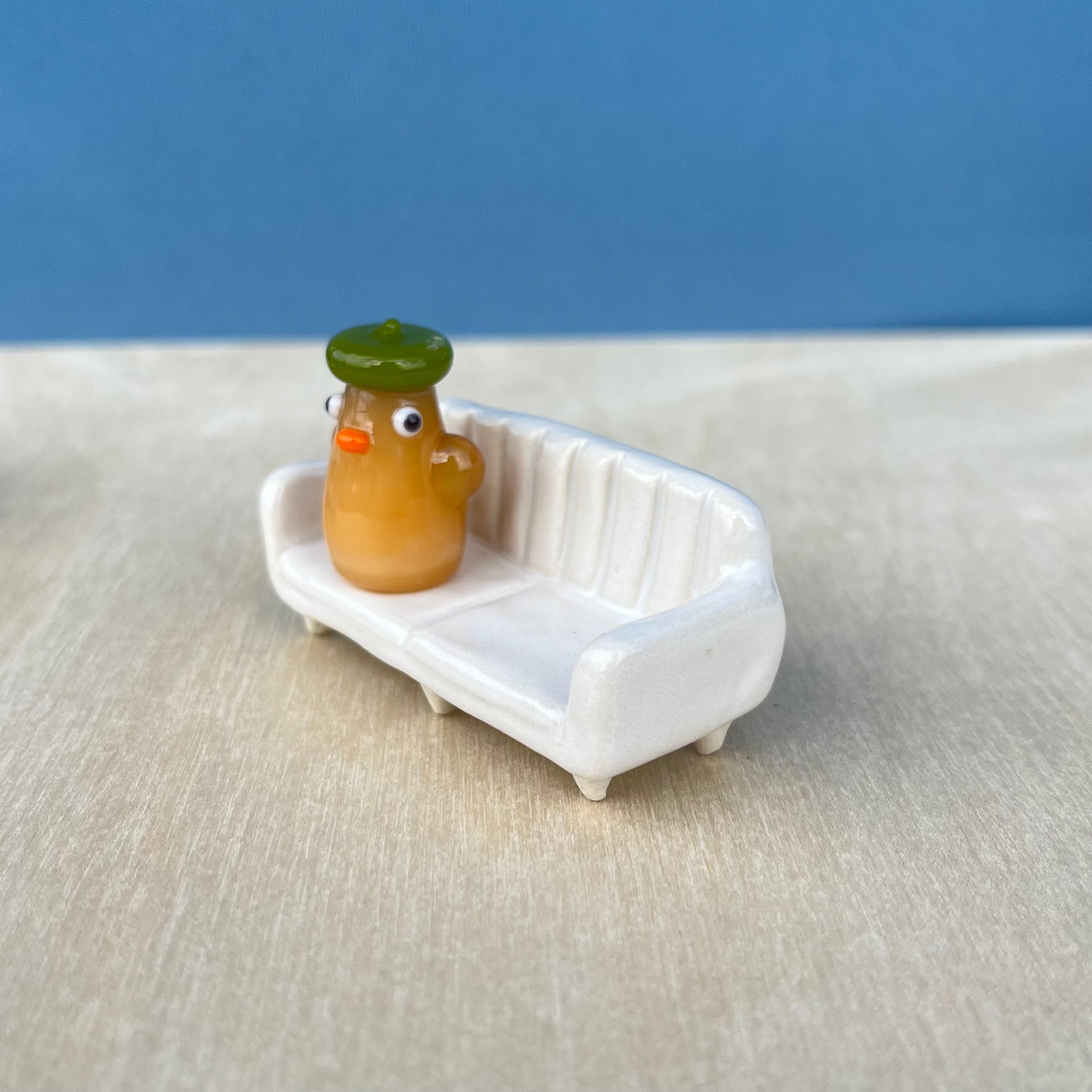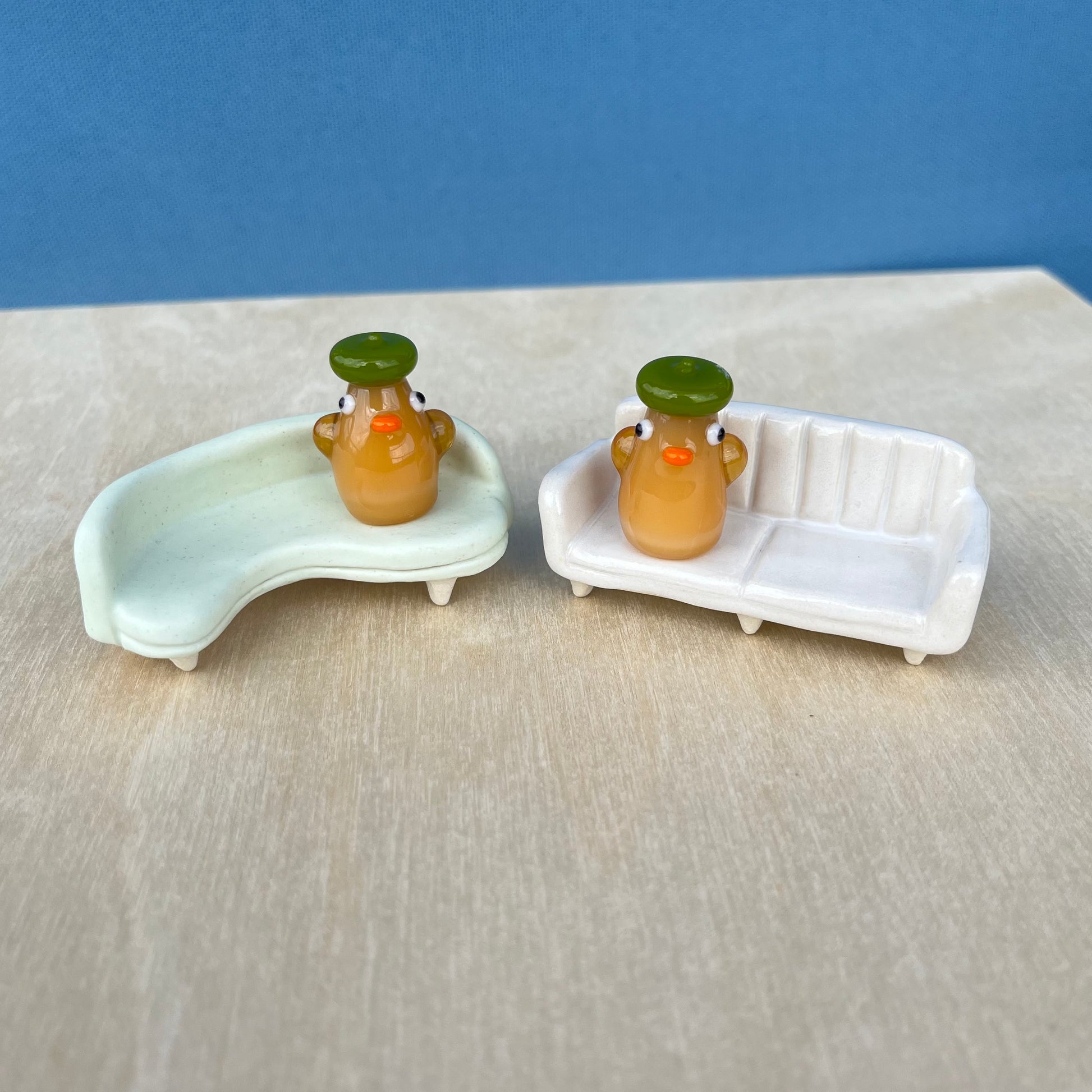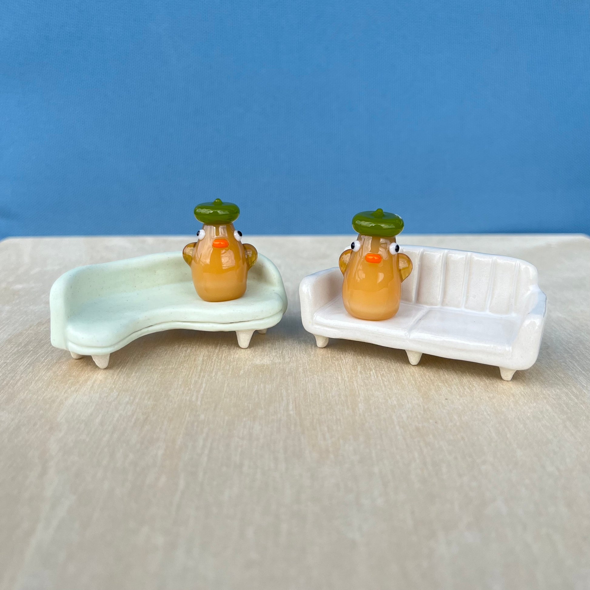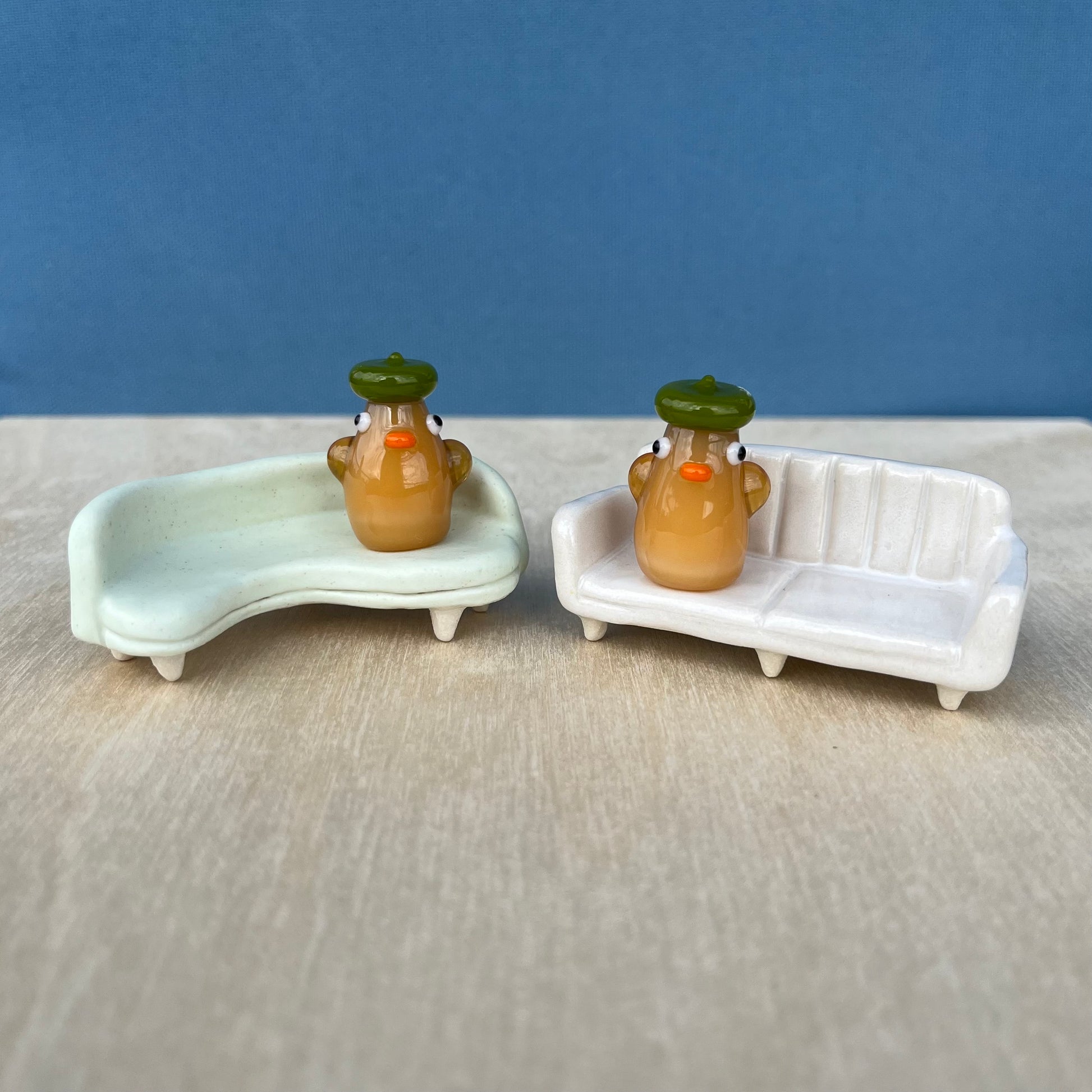 Jenni Liu is a lifelong Seattleite who took her first pottery class in 2019 and after a bit of a rough start, fell in love with the medium. She enjoys making cheerful functional pieces, including ducks, eggs, potatoes, and other food themed pieces. She recently started playing around with making miniatures, including the couches in this collaboration.