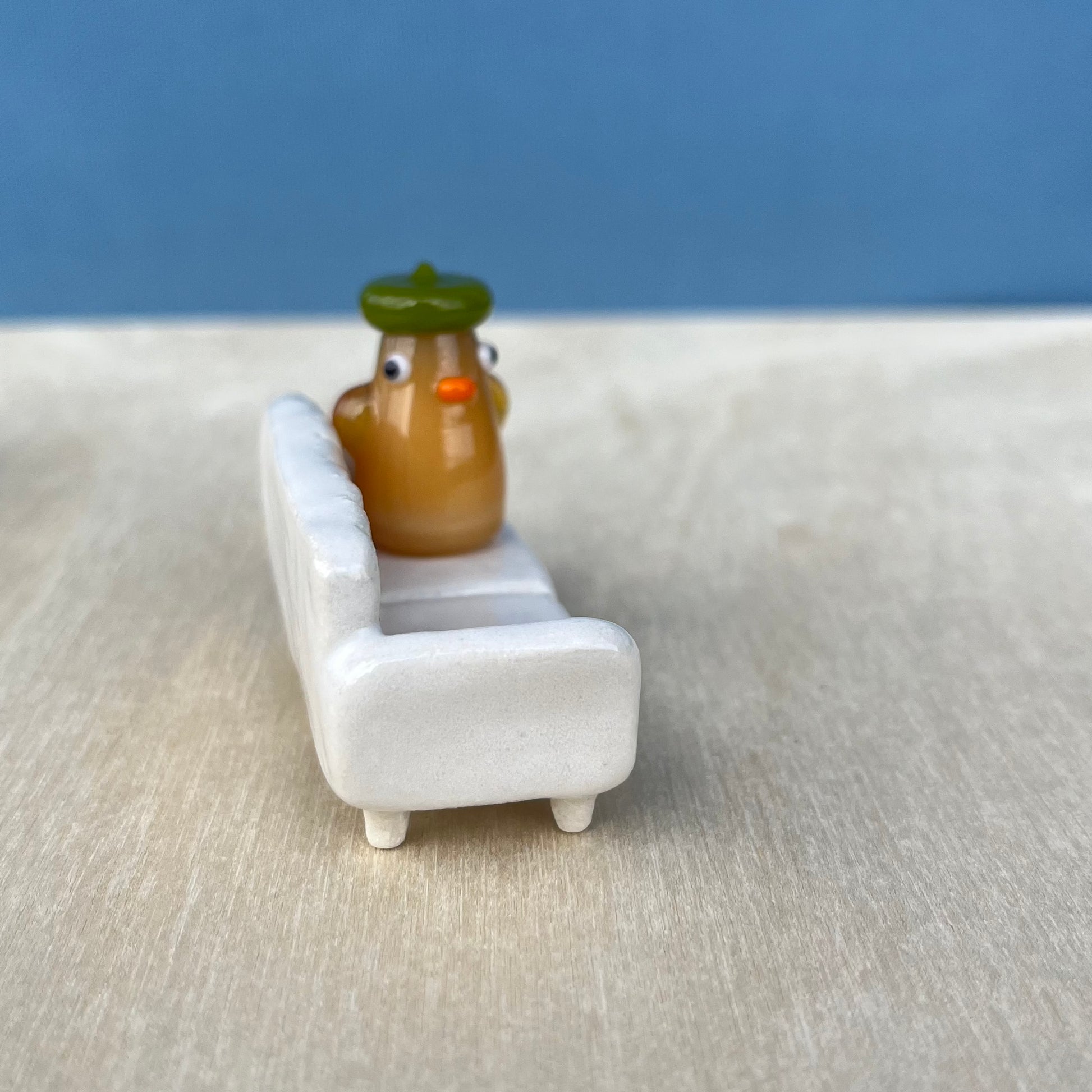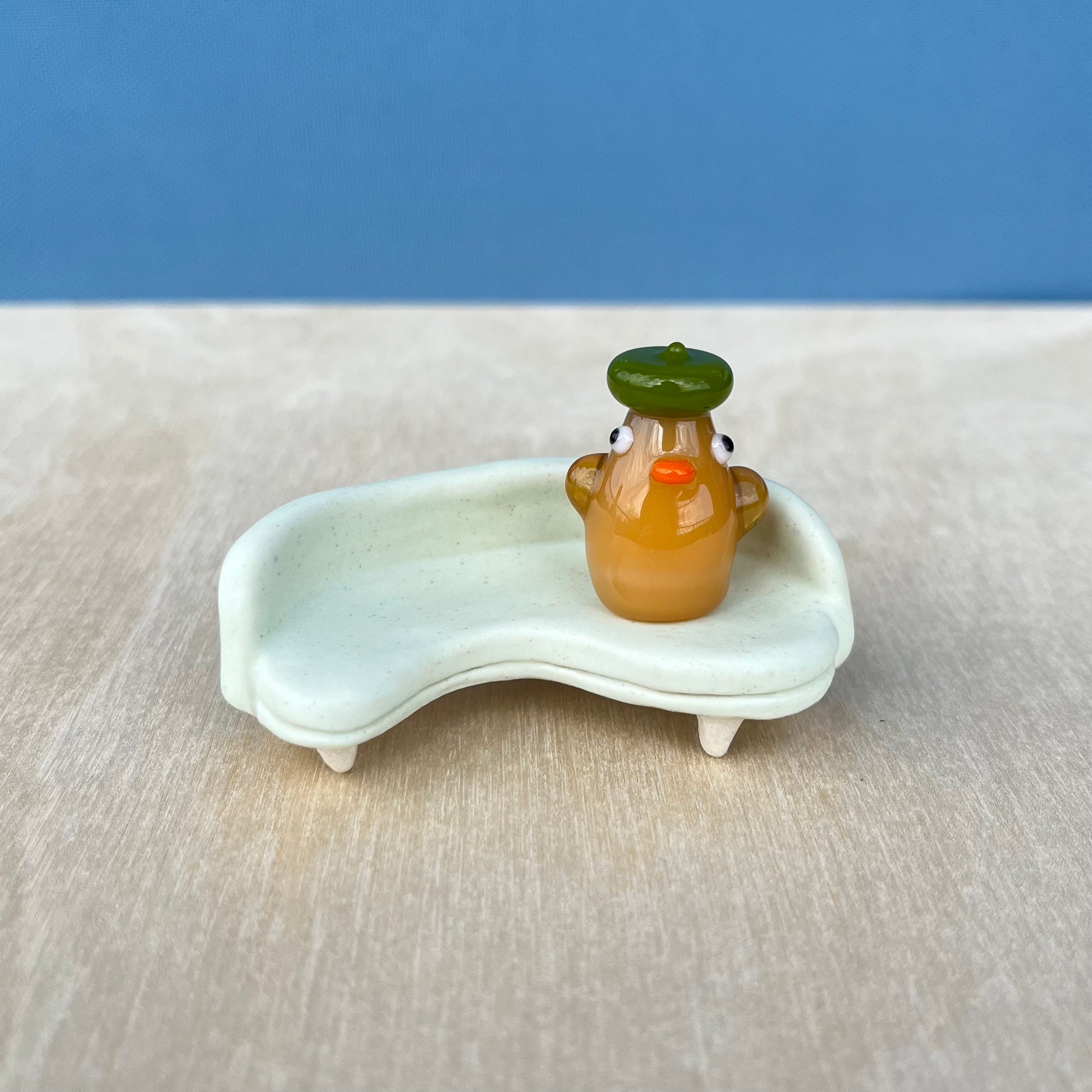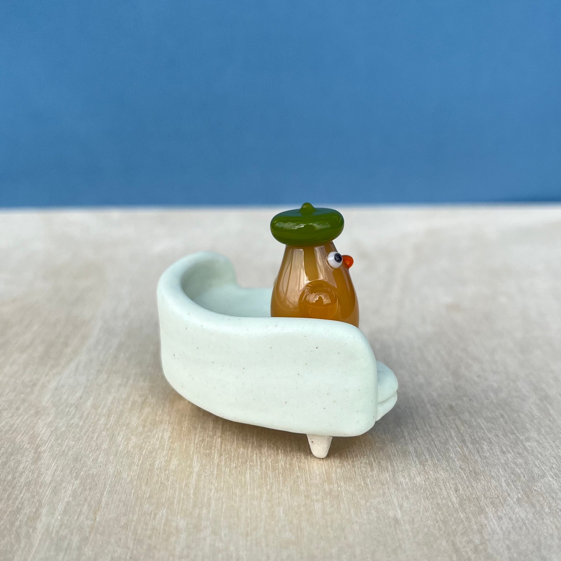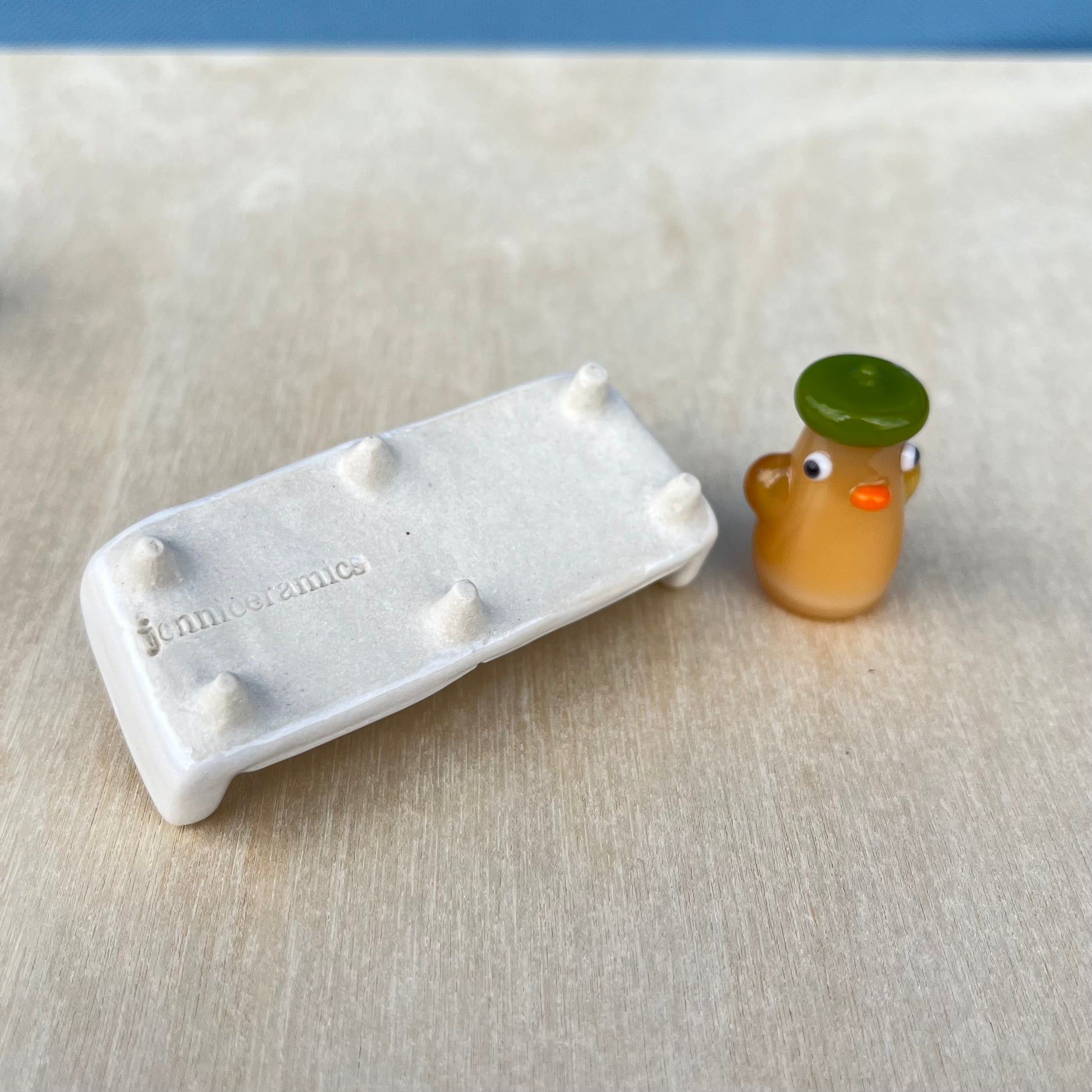 Jenni Liu is a lifelong Seattleite who took her first pottery class in 2019 and after a bit of a rough start, fell in love with the medium. She enjoys making cheerful functional pieces, including ducks, eggs, potatoes, and other food themed pieces. She recently started playing around with making miniatures, including the couches in this collaboration.