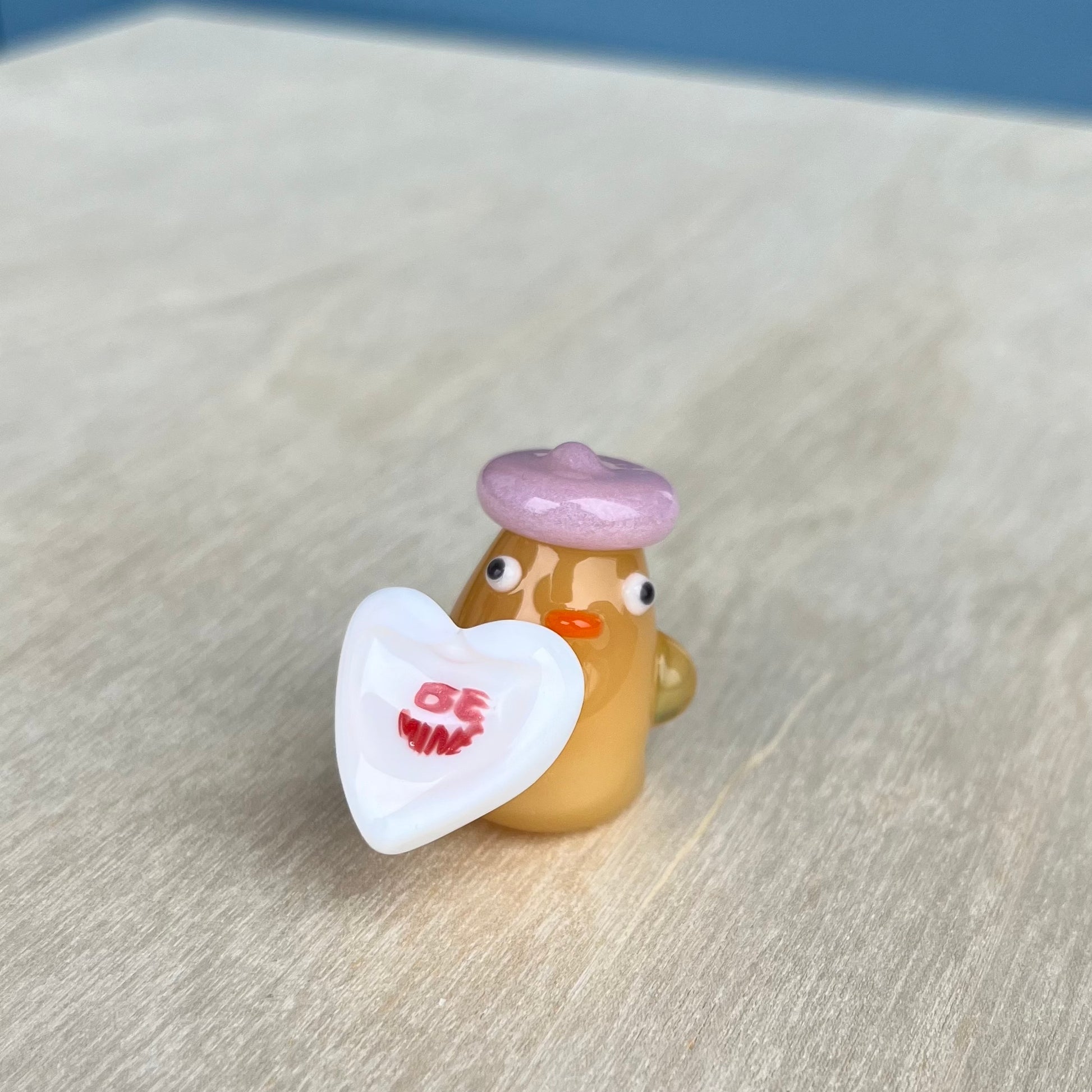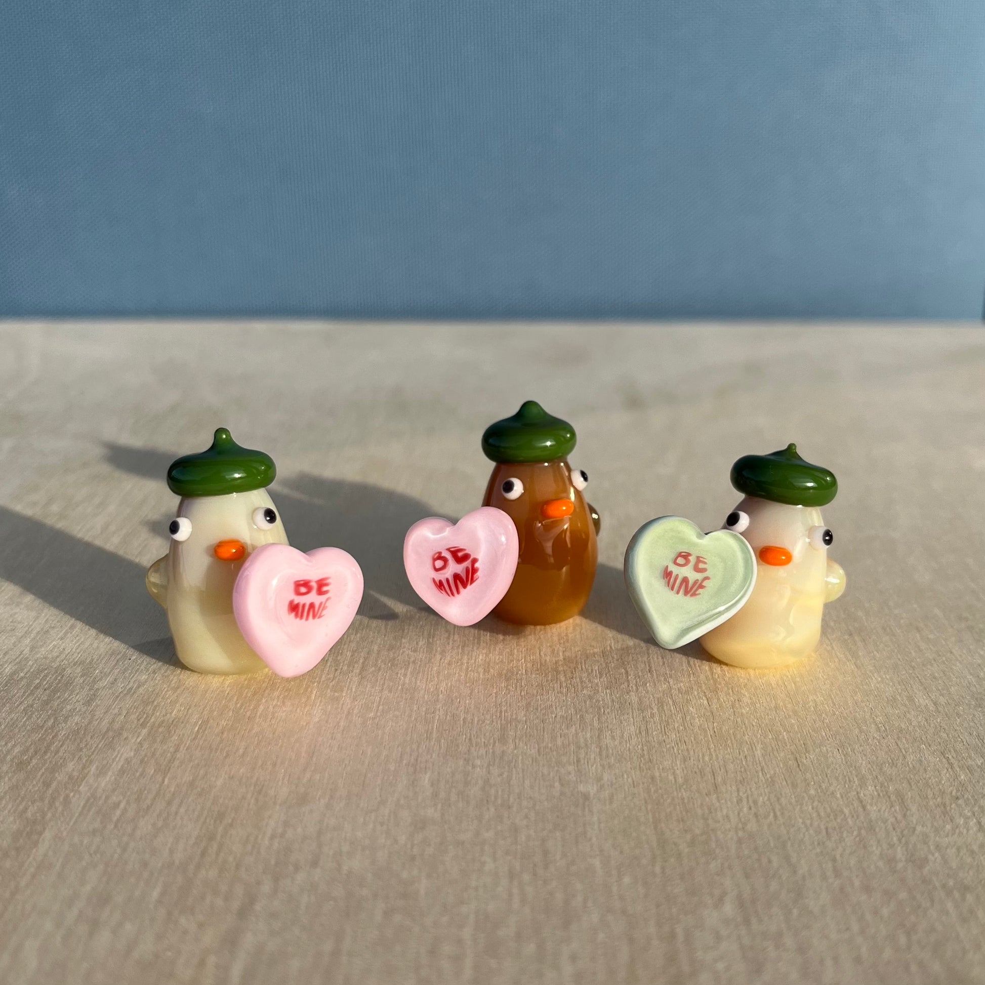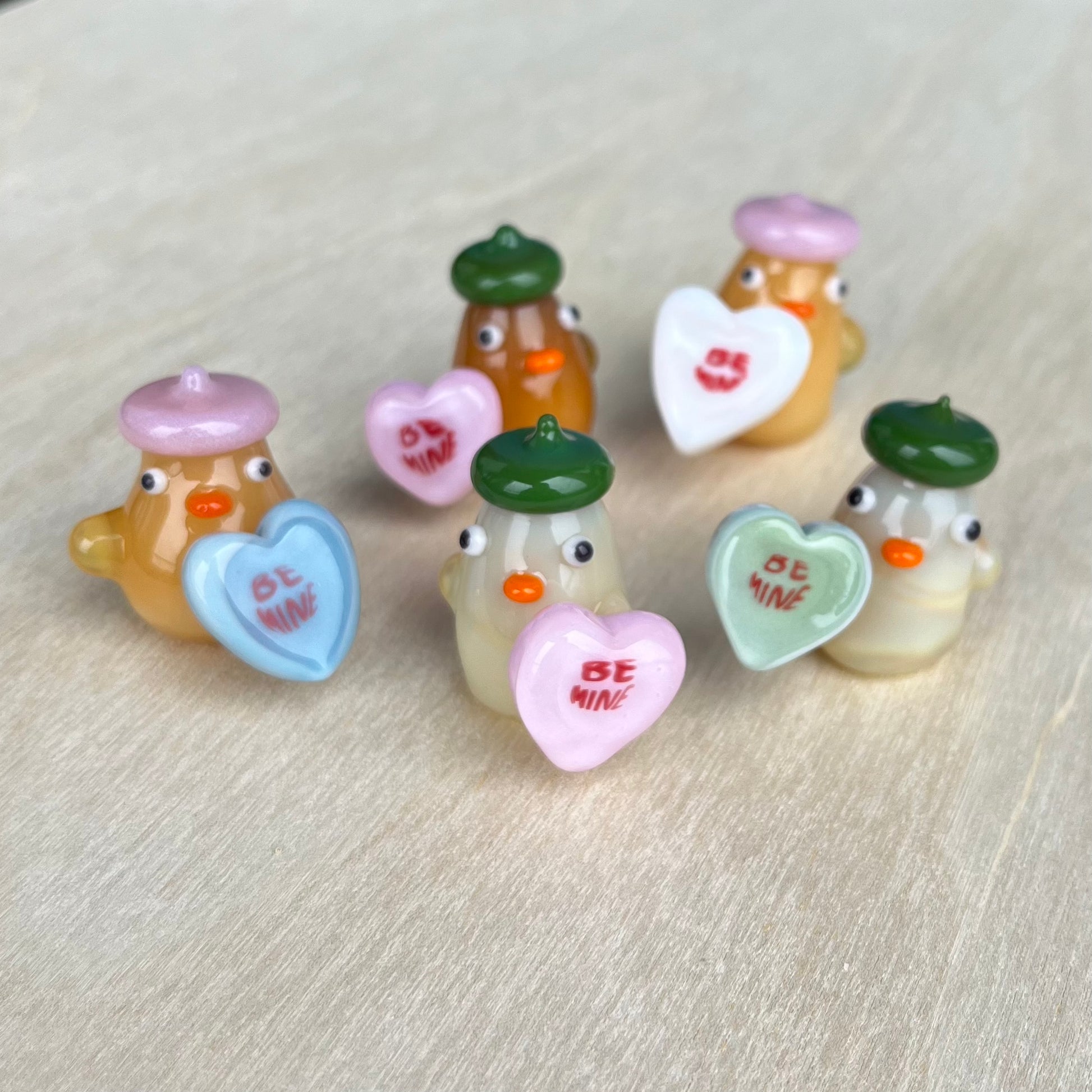 Aaron is a very skilled flameworker in Seattle and has been making elaborate glass sculptures for about a decade. He creates amazing pieces of tiny text in glass, so of course we did a collaboration and gave each duck a tiny "BE MINE" conversation heart candy. : )