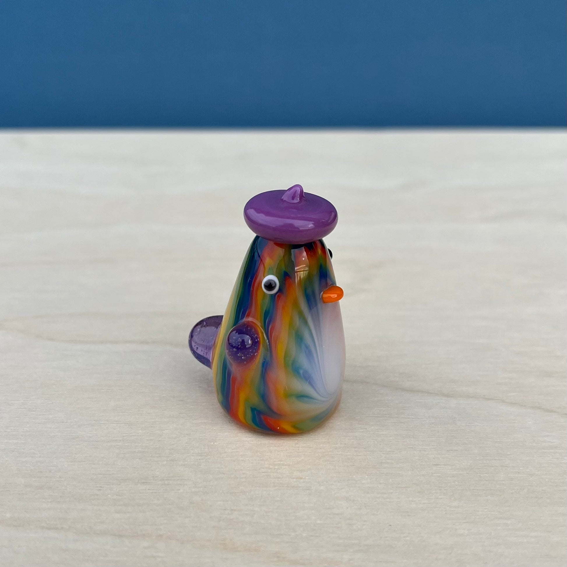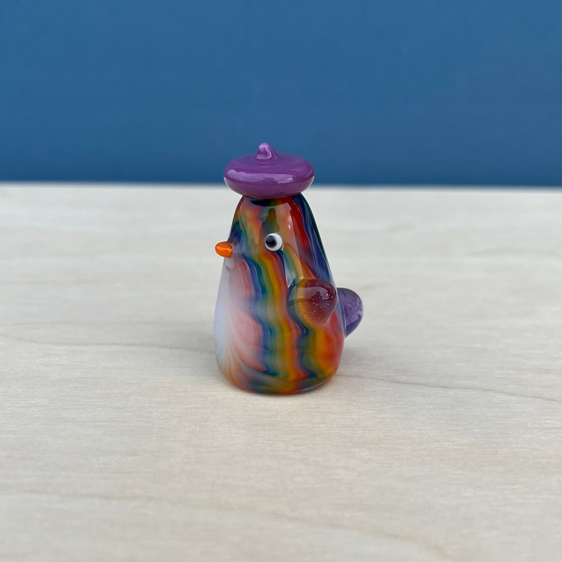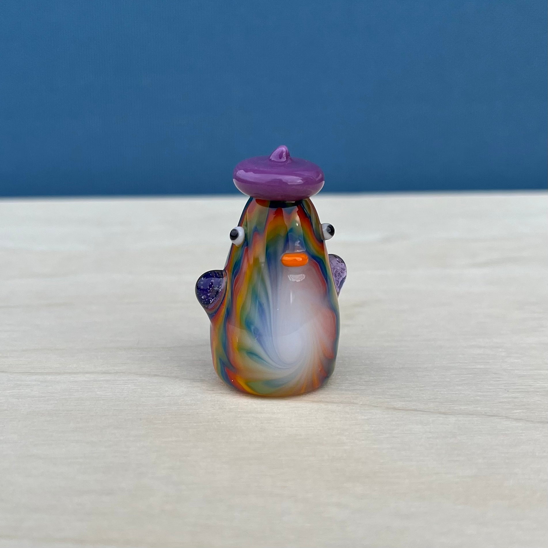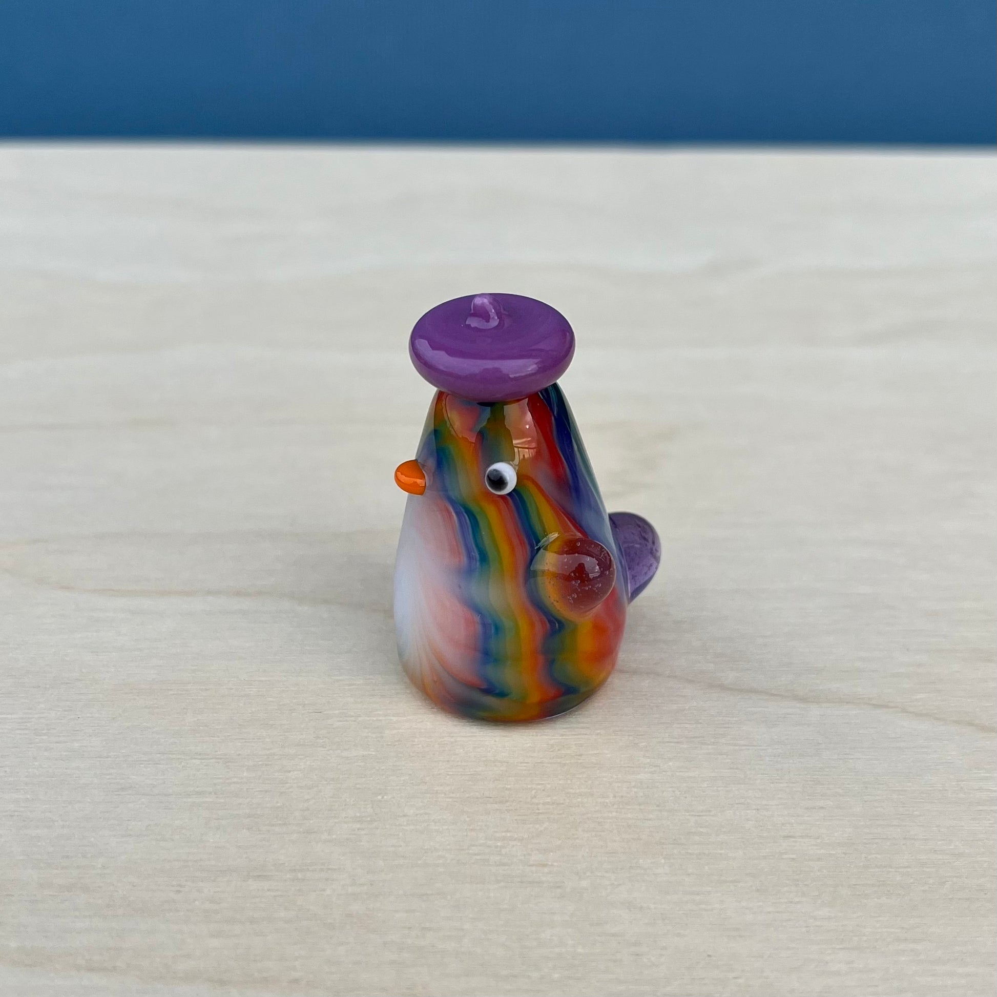 Aaron is a very skilled flameworker in Seattle and has been making elaborate glass sculptures for about a decade. He created intricate tie-dye patterns for the duckies to have, and I gave each of them a unique hat + lil wings combo. : )
