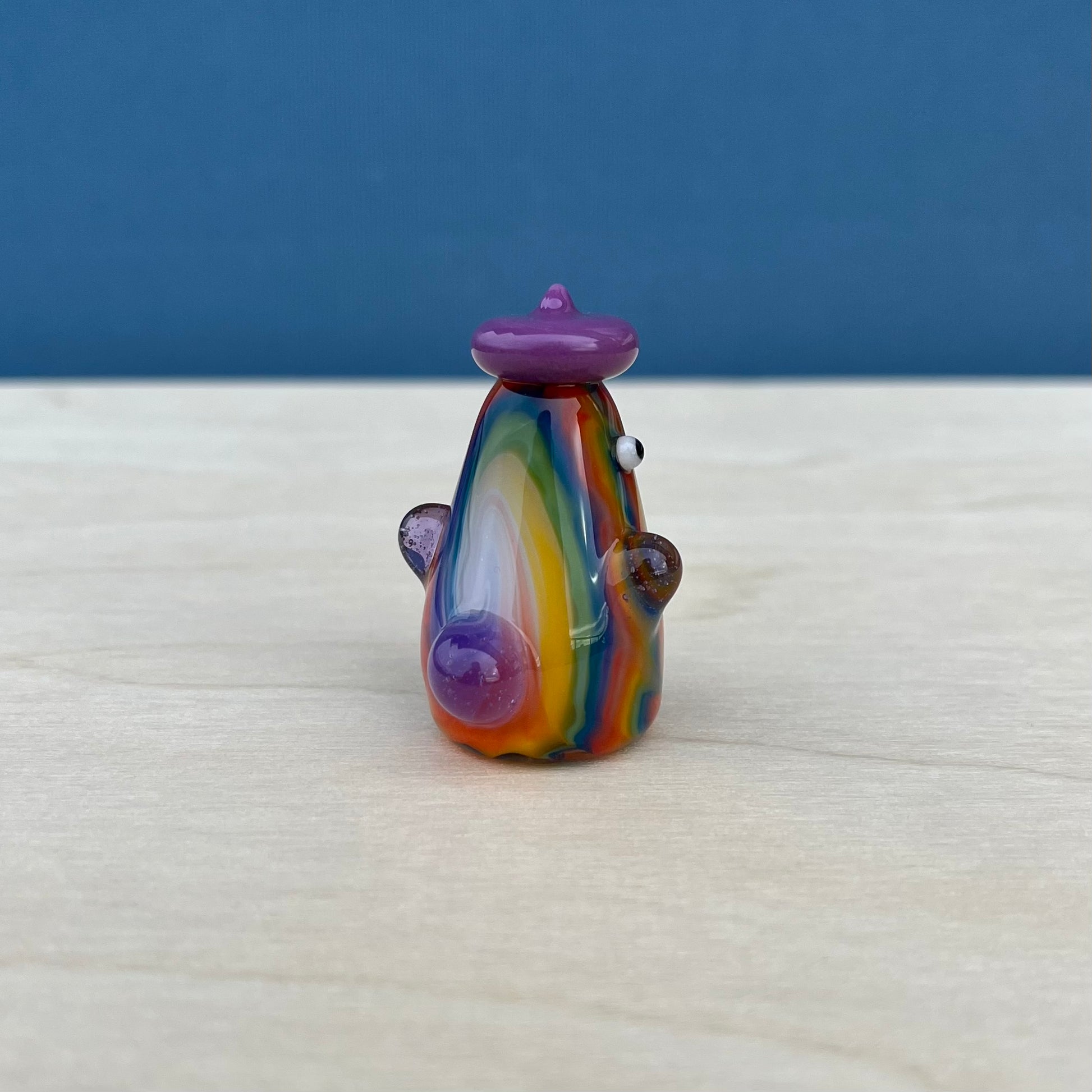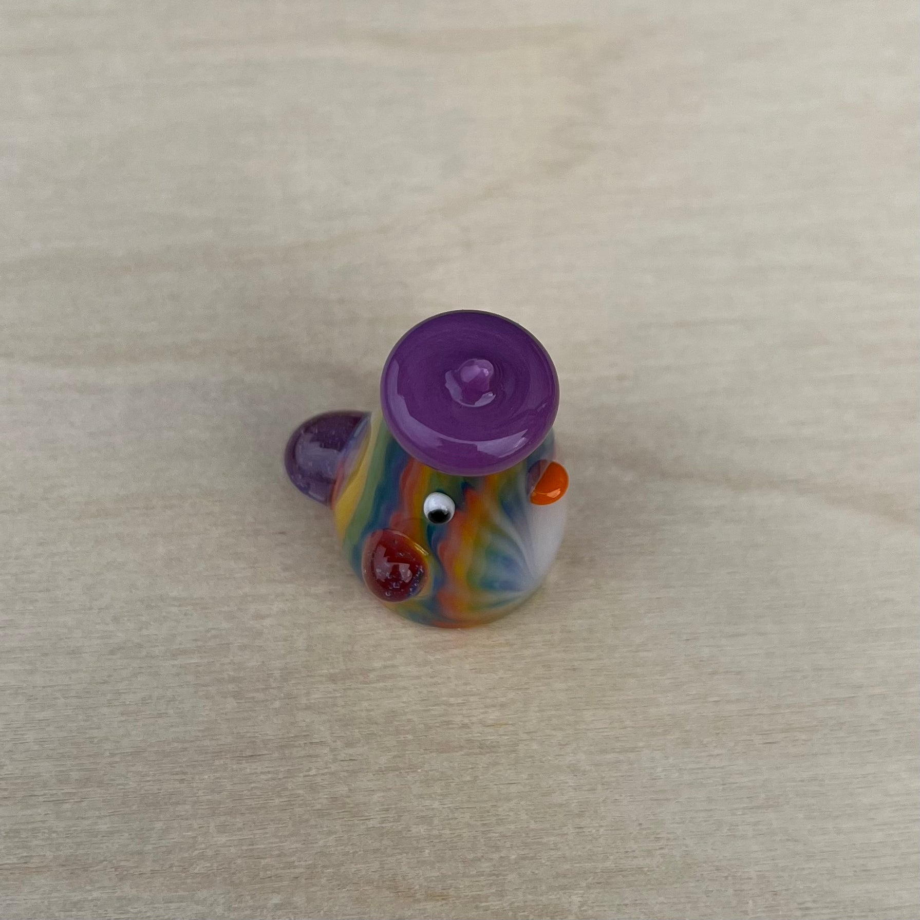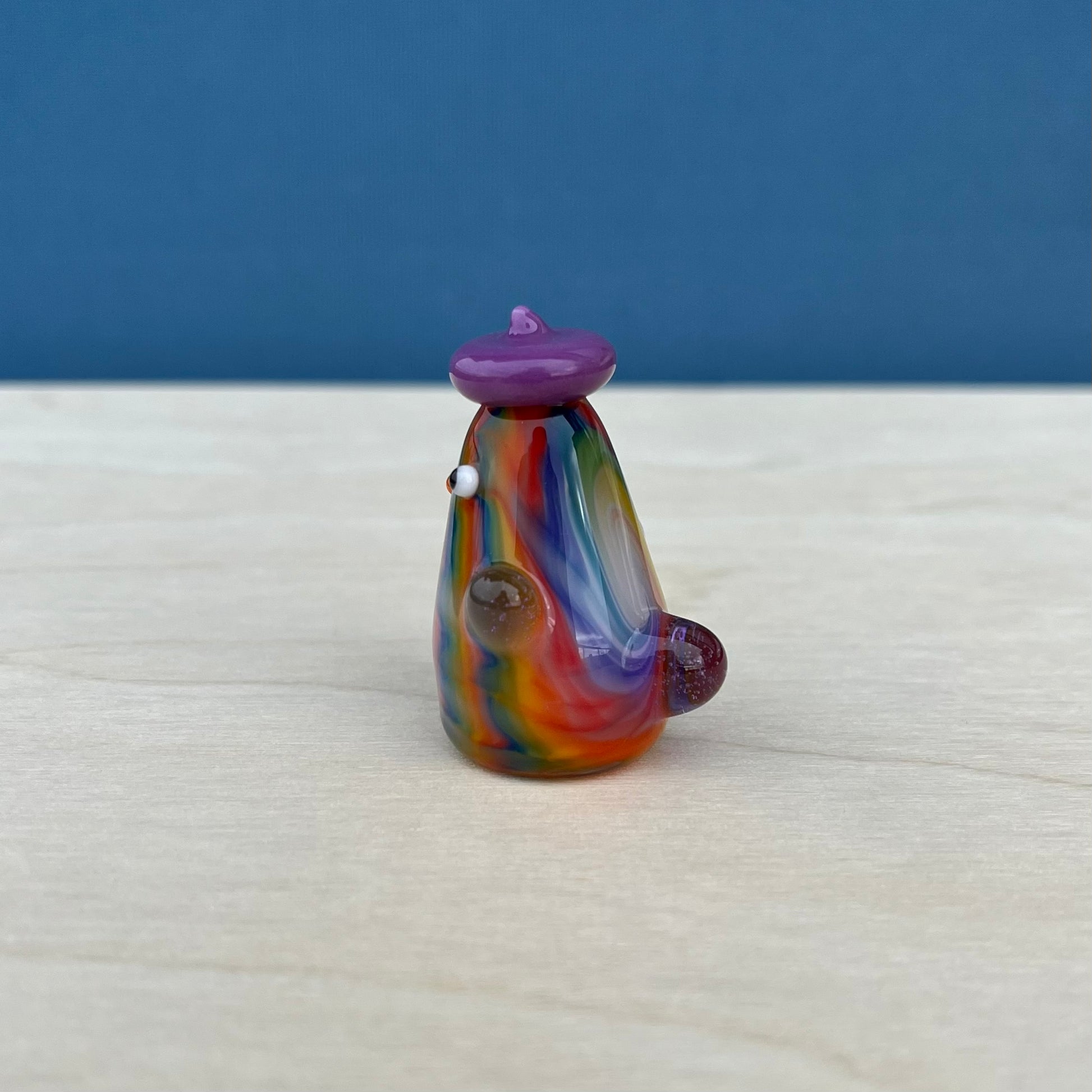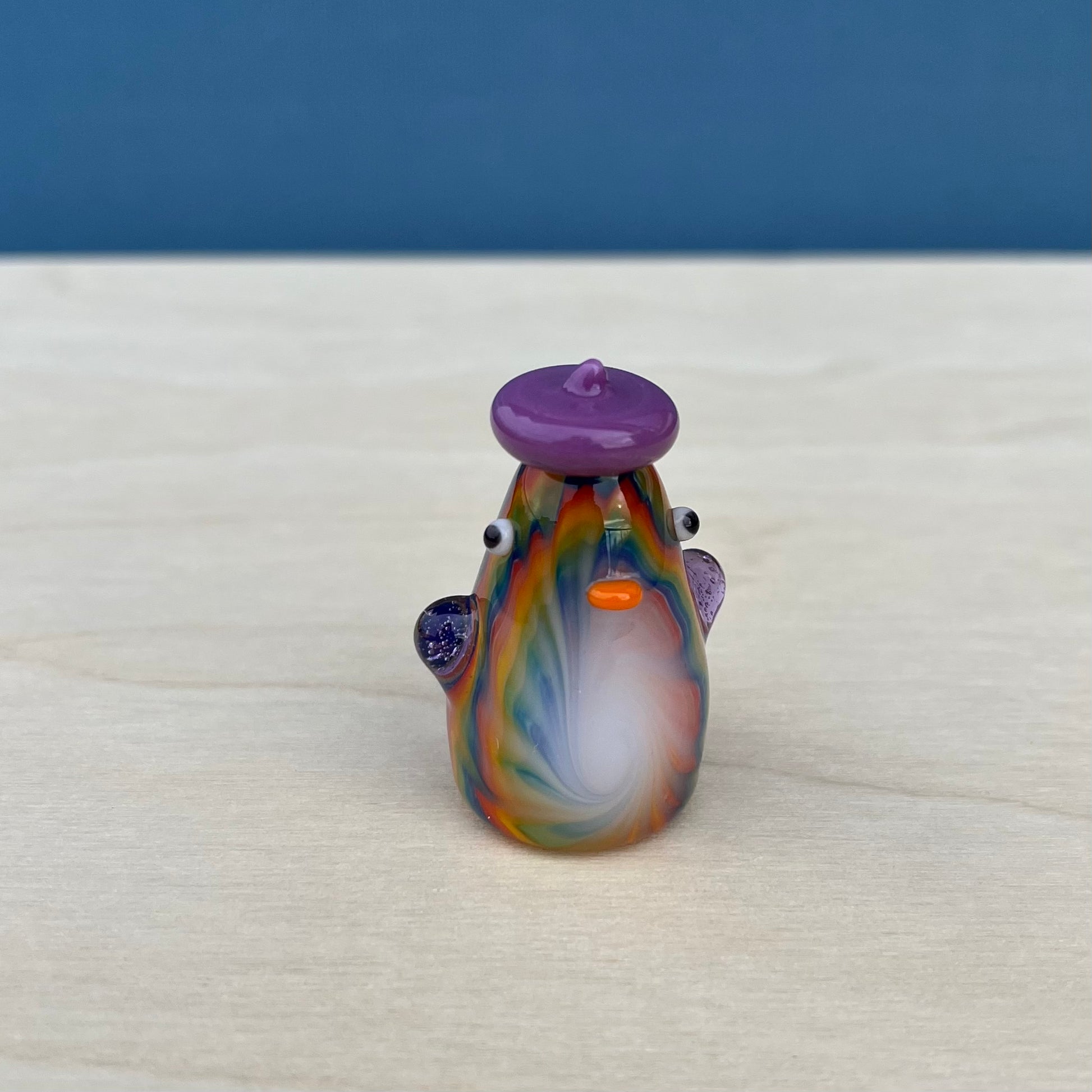 Aaron is a very skilled flameworker in Seattle and has been making elaborate glass sculptures for about a decade. He created intricate tie-dye patterns for the duckies to have, and I gave each of them a unique hat + lil wings combo. : )